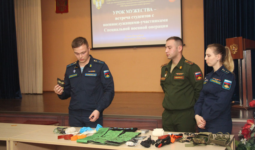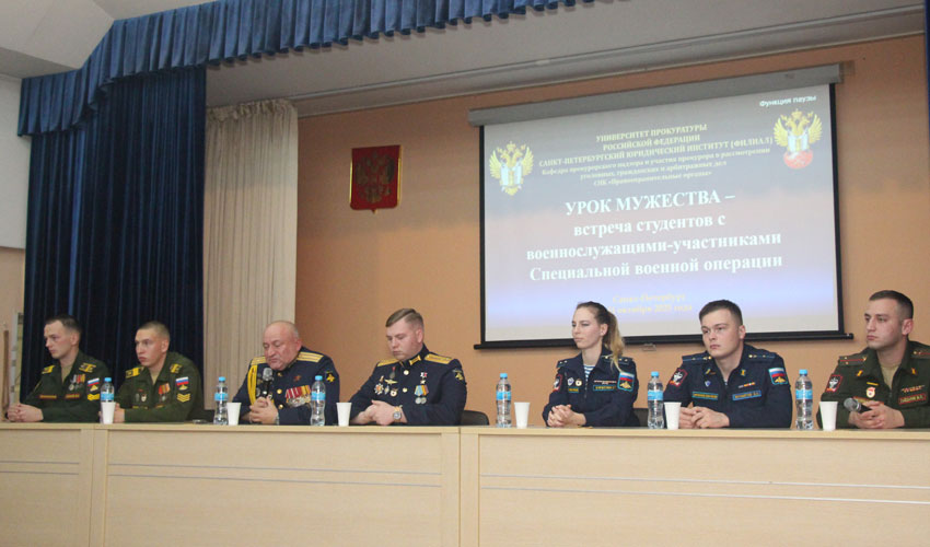31 октября 2025 г. в Санкт-Петербургском филиале Университета прокуратуры Российской Федерации прошло традиционное мероприятие – Урок мужества с участниками Специальной военной операции. Открыл Урок мужества заместитель директора Института, советник юстиции Шобухин В.Ю. В своём выступлении он поблагодарил военнослужащих за мужество и героизм, отметив, что Россия во все время отстаивала свою самобытность, а её верные сыны не щадили себя в битве за Родину. В завершении речи Владимир Юрьевич также поздравил студентов и гостей с наступающим праздником Дня народного единства. Руководитель Патриотического клуба Вересов М. и староста студенческого научного кружка «Правоохранительные органы» Иванова А. представили доклад о причинах, целях и задачах Специальной военной операции. Отдельно, студенты рассказали о направлениях деятельности Патриотического клуба Института в рамках поддержки участников СВО. Перед обучающимися выступили представители Военно-воздушных Сил Российской Федерации, военные медики из Военно-медицинской Академии им. С.М. Кирова, курсанты-участники СВО, представители высших военных учебных заведений. Каждый участник СВО выступил с рассказом о себе и о своем боевом пути в ходе Специальной военной операции, поделился самым значимым эпизодом, связанным с боевыми действиями: говорили о подвигах своих сослуживцев, о переосмыслении жизненных ориентиров. Многие военные награждены высшими государственными наградами: «Герой России», «Орденом мужества», медаль «за Отвагу». Также на Уроке мужества выступила Бычкова Л.А., мама участника Специальной Военной операции Бычкова А.А., выпускника Российской таможенной академии, погибшего при обороне Курской области, в Суджанском районе у деревни Новая Сорочина. Бычков А.А., будучи студентом Российской Таможенной академии, в 2022 году добровольцем ушел на СВО и, вернувшись, выступал перед нами на таком же Уроке мужества в мае 2023 года. Многие из нас хорошо помнят его выступление, его патриотический настрой, его желание защитить свой народ, его веру в справедливость, веру в нашу Победу. Затем Александр добровольно еще дважды отправлялся в зону СВО, 13 ноября 2024 года он пал смертью храбрых, освобождая от врага Курскую область. Лилия Алексеевна рассказала гостям и студентам о боевом пути, героизме и подвигах своего сына, искреннего патриота России. Студенты задавали почетным гостям вопросы о ходе Специальной военной операции, тактике ведения войны в 21 веке, условиях службы в различных подразделениях, взаимоотношениях с мирным населением на освобожденных территориях. Спрашивали и о смене мировоззрения после возвращения со Специальной военной операции. В завершении Урока мужества военнослужащие Военно-медицинской академии имени С.М. Кирова продемонстрировали для студентов основы тактической медицины, после чего состоялся концерт, подготовленный Вокально-хореографическим клубом Института. Благодарим за организацию Урока мужества Дытченко Г.В., старшего преподавателя кафедры прокурорского надзора и участия прокурора в рассмотрении уголовных, гражданских и арбитражных дел Института.
