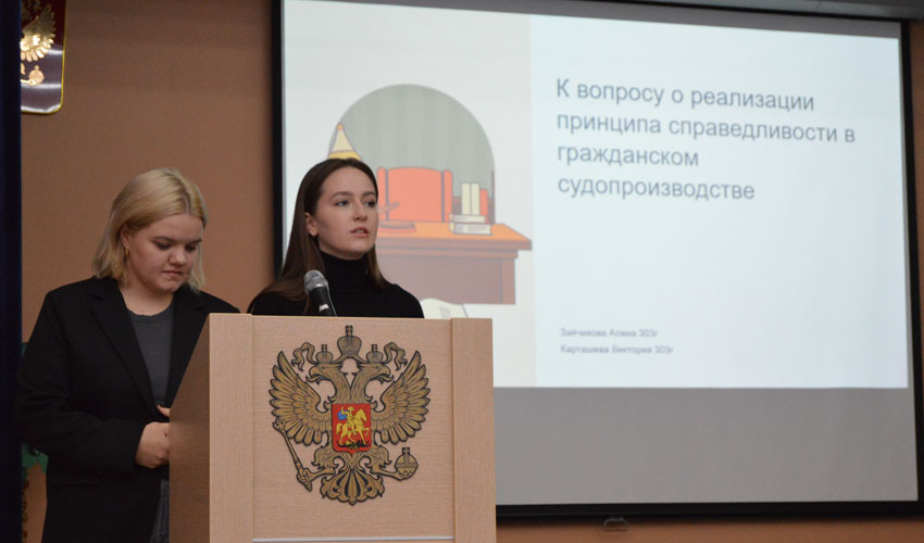 - Зайчикова Алёна, Карташева Виктория, студентки 3 курса – «К вопросу о реализации принципа справедливости в гражданском судопроизводстве»;