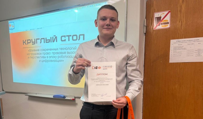 13-14 ноября 2025 г. в Московском государственном юридическом университете имени О.Е. Кутафина (МГЮА) прошел XII Студенческий юридический форум. Победителем круглого стола «Влияние современных технологий на трудовое право: правовые вызовы и перспективы в эпоху роботизации и цифровизации» стал студент 4 курса юридического факультета Санкт-Петербургского филиала Университета прокуратуры Российской Федерации Андреев Даниил. Поздравляем победителя и желаем ему дальнейших научных достижений! |