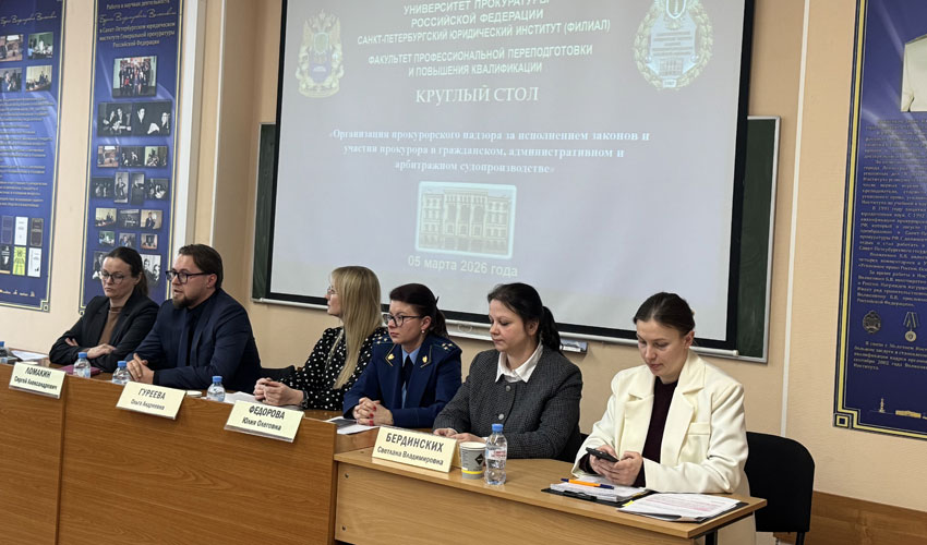 05 марта 2026 г. в Санкт-Петербургском филиале Университета прокуратуры Российской Федерации в рамках реализации образовательной программы профессиональной переподготовки прокурорских работников, состоящих в резерве кадров для выдвижения на должности прокуроров городов, районов и приравненных к ним прокуроров, состоялся круглый стол «Организация прокурорского надзора за исполнением законов и участия прокурора в гражданском, административном и арбитражном судопроизводстве». В работе круглого стола приняли участие начальник отдела по обеспечению участия прокуроров в рассмотрении судами гражданских и административных дел, экономических споров, дел об административных правонарушениях управления по обеспечению участия прокуроров гражданском и арбитражном процессе Федорова Ю.О., прокурор отдела по обеспечению участия прокуроров в гражданском и арбитражном процессе прокуратуры Ленинградской области Ломакин С.А., старший помощник Северо-Западного транспортного прокурора по обеспечению участия прокуроров в гражданском и арбитражном процессе Позднякова А.А., начальник учебно-методического отдела прокуратуры Санкт-Петербурга – старший прокурор межрегионального центра профессионального обучения прокурорских работников и федеральных государственных гражданских служащих Родимкина Е.В., прокурор второго отдела (апелляционно-кассационного) (с дислокацией в Санкт-Петербурге) апелляционно-кассационного управления Главного гражданско-судебного управления Бердинских С.В., слушатели факультета профессиональной переподготовки и повышения квалификации – прокурорские работники, состоящие в резерве кадров для выдвижения на должности прокуроров городов, районов и приравненных к ним прокуроров, профессорско-преподавательский состав Института. На круглом столе обсуждены актуальные вопросы прокурорского надзора за исполнением законов и соответствием законам правовых актов, а также отдельные вопросы организации участия прокуроров в гражданском, арбитражном и административном судопроизводстве. В ходе дискуссионной части круглого стола участники обменялись мнениями по актуальным вопросам правоприменительной практики. |