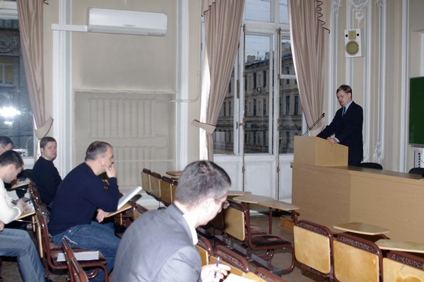 15 октября 2013 г. на факультете профессиональной переподготовки и повышения квалификации в рамках профессиональной переподготовки прокурорских работников, состоящих в резерве кадров для выдвижения на должности прокуроров городов и районов и приравненных к ним прокуроров специализированных прокуратур советник Уполномоченного по правам человека в Санкт-Петербурге К.Е. Шарыгин провел со слушателями учебное занятие по теме: «Взаимодействие уполномоченных по правам человека в Российской Федерации с органами прокуратуры в деле защиты прав граждан».