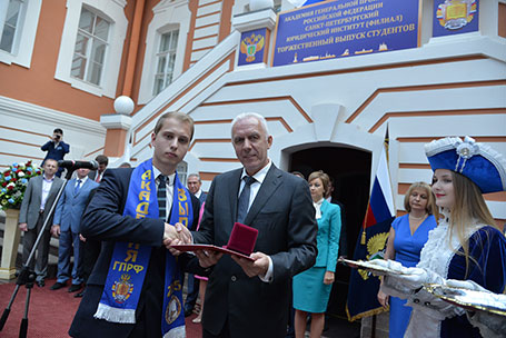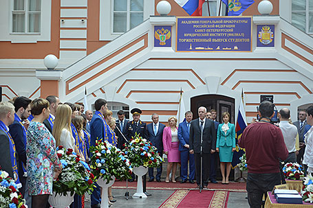 15 июля 2015 г. в атриуме Комендантского дома Петропавловской крепости состоялось торжественное вручение дипломов выпускникам юридического факультета Санкт-Петербургского юридического института (филиала) Академии Генеральной прокуратуры Российской Федерации 2015 г. В церемонии вручения дипломов приняли участие заместитель Генерального прокурора РФ Гуцан А.В., заместитель полномочного представителя Президента Российской Федерации в Северо-Западном федеральном округе Логунов О.В., ректор Академии профессор Капинус О.С., директор Санкт-Петербургского филиала Академии Штадлер Г.В., начальник Управления Генеральной прокуратуры РФ в Северо-Западном федеральном округе Солнышкина Н.Е., советник Генерального прокурора РФ в Северо-Западном федеральном округе Васильева Т.А., Северо-Западный транспортный прокурор Колесов О.А., прокурор Санкт-Петербурга Литвиненко С.И., прокурор Ленинградской области Иванов С.Г., прокурор Новгородской области Кикоть А.В., председатель Ленинградского областного суда Шевчук В.Б., главный федеральный инспектор по Санкт-Петербургу Миненко В.А., главный федеральный инспектор по Ленинградской области Лукаушкина Т.В. и другие руководители органов власти и правоохранительных структур, профессорско-преподавательский состав Института и родители выпускников. В 2015 году юридический факультет Санкт-Петербургского юридического института (филиала) Академии Генеральной прокуратуры Российской Федерации успешно окончили 168 человек. Дипломы специалистов по специальности «Юриспруденция» получили 93 выпускника, из них 22 дипломы с отличием; дипломы бакалавров по специальности «Юриспруденция» получили 75 выпускников, из них 12 дипломы с отличием. Церемонию вручения открыли ректор Академии профессор Капинус О.С. и директор Института Штадлер Г.В. С успешным окончанием обучения в Академии выпускников поздравили заместитель Генерального прокурора РФ Гуцан А.В., заместитель полномочного представителя Президента Российской Федерации в Северо-Западном федеральном округе Логунов О.В. Выпускникам Академии – шести стипендиатам Генерального прокурора Российской Федерации, завершившим обучение с отличием, от имени Генерального прокурора Российской Федерации дипломы вручил заместитель Генерального прокурора Российской Федерации государственный советник юстиции 1 класса Гуцан А.В. В ходе праздничных мероприятий, посвященных выпуску студентов Академии, в соборе Святых первоверховных апостолов Петра и Павла состоялось возложение цветов к усыпальнице Петра Великого. В честь выпускников Академии был произведён почётный развод караула Петропавловской крепости. В церемонии развода караула принимает участие личный состав 165 отдельной стрелковой роты почетного караула и оркестр штаба Ленинградского военного округа. Детальный церемониал смены караула был разработан в царствование императора Павла I и просуществовал до начала ХХ века. Церемония смены караула проводилась на площади перед Петропавловским собором. Современная церемония развода караула в Петропавловской крепости, разработанная Военной комендатурой Санкт-Петербурга, носит символический характер. Самыми яркими моментами церемонии являются плац-парад и вынос флага Российской Федерации и флага Санкт-Петербурга. В честь выпускников Академии был про