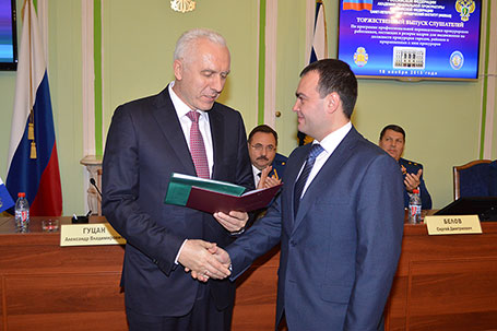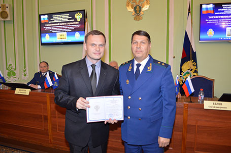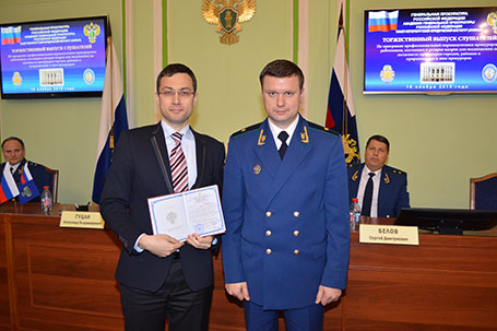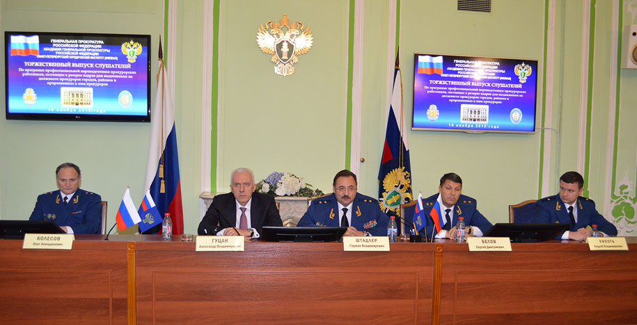 В завершение итоговой аттестации заместитель Генерального прокурора Российской Федерации государственный советник юстиции 1 класса Гуцан А.В. и члены государственной аттестационной комиссии в торжественной обстановке вручили слушателям дипломы о профессиональной переподготовке на ведение профессиональной деятельности в сфере организации работы и управления в прокуратуре района, города и приравненной к ним прокуратуре.