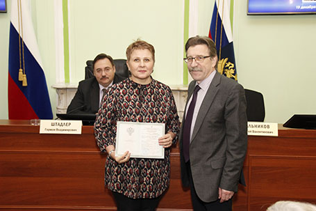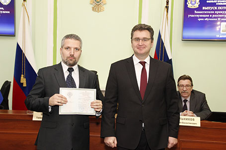 19 декабря 2017 г. в Санкт-Петербургском филиале Академии Генеральной прокуратуры Российской Федерации проведена итоговая аттестация слушателей, проходивших обучение по программе повышения квалификации заместителей прокуроров городов и районов, участвующих в рассмотрении уголовных дел судами. В течение обучения слушатели приобрели дополнительные навыки организации работы и управления в прокуратуре города и района, а также обновили имеющиеся знания по разделам учебной программы: сложные вопросы квалификации преступлений; участие прокурора в рассмотрении уголовных дел судами; особенности тактики и методики поддержания государственного обвинения по уголовным делам отдельных категорий преступлений; правовая психология. В ходе проведенных деловых игр и тренингов «Участие прокурора в формировании коллегии присяжных заседателей», «Участие прокурора в рассмотрении уголовного дела с присяжными заседателями» слушатели выработали практические навыки поддержания государственного обвинения по уголовным делам, рассматриваемым с участием коллегии присяжных. На проведенном круглом столе «Актуальные вопросы участия прокурора в рассмотрении уголовных дел судами» обсудили ряд наиболее актуальных вопросов деятельности прокуроров, участвующих в рассмотрении уголовных дел судами. В завершение итоговой аттестации в торжественной обстановке директора Института Штадлер Г.В. и заместители директора Института Сальников А.В., Корсунов А.Д. и Сапожков А.А. поздравили слушателей с успешным окончанием обучения и вручили удостоверения о повышении квалификации.