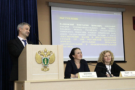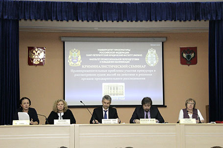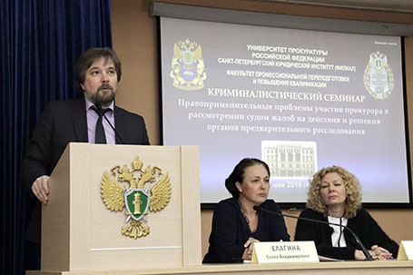 31 мая 2018 г. в Санкт-Петербургском филиале Университета прокуратуры Российской Федерации в целях реализации образовательной программы на наборе слушателей, обучающихся по программе повышения квалификации заместителей прокуроров городов и районов, обеспечивающих надзор за исполнением законов органами, осуществляющими дознание и предварительное следствие, состоялся криминалистический семинар «Правоприменительные проблемы участия прокурора в рассмотрении судом жалоб на действия и решения органов предварительного расследования». В работе криминалистического семинара приняли участие старший прокурор отдела по надзору за оперативно-розыскной и процессуальной деятельностью Управления Генеральной прокуратуры Российской Федерации в Северо-Западном федеральном округе – М.Г. Усачева, заместитель начальника управления по надзору за уголовно-процессуальной и оперативно-розыскной деятельностью прокуратуры Ленинградской области – С.С. Бажутов, прокурор апелляционного отдела уголовно-судебного управления прокуратуры г. Санкт-Петербурга – Ю.С. Васильева, аспирант очной формы обучения кафедры уголовного процесса и криминалистики Санкт-Петербургского юридического института (филиала) Университета прокуратуры Российской Федерации – Е.А. Кузьмина, заведующий кафедрой уголовно-процессуального права Северо-Западного филиала «Российский государственный университет правосудия» – К.Б. Калиновский, слушатели факультета – заместители прокуроров городов и районов, обеспечивающие надзор за исполнением законов органами, осуществляющими дознание и предварительное следствие, а также профессорско-преподавательский состав Санкт-Петербургского юридического института (филиала) Университета прокуратуры Российской Федерации. На криминалистическом семинаре обсуждены актуальные вопросы современной практики и проблем применения норм законодательства, регламентирующих участие прокурора в рассмотрении судом жалоб на действия и решения органов предварительного расследования. В ходе дискуссионной части круглого стола участники обменялись мнениями по вопросам организации и участия прокурора в рассмотрении судом жалоб на действия и решения органов предварительного расследования, обсудили направления совершенствования прокурорской деятельности в указанной сфере.
