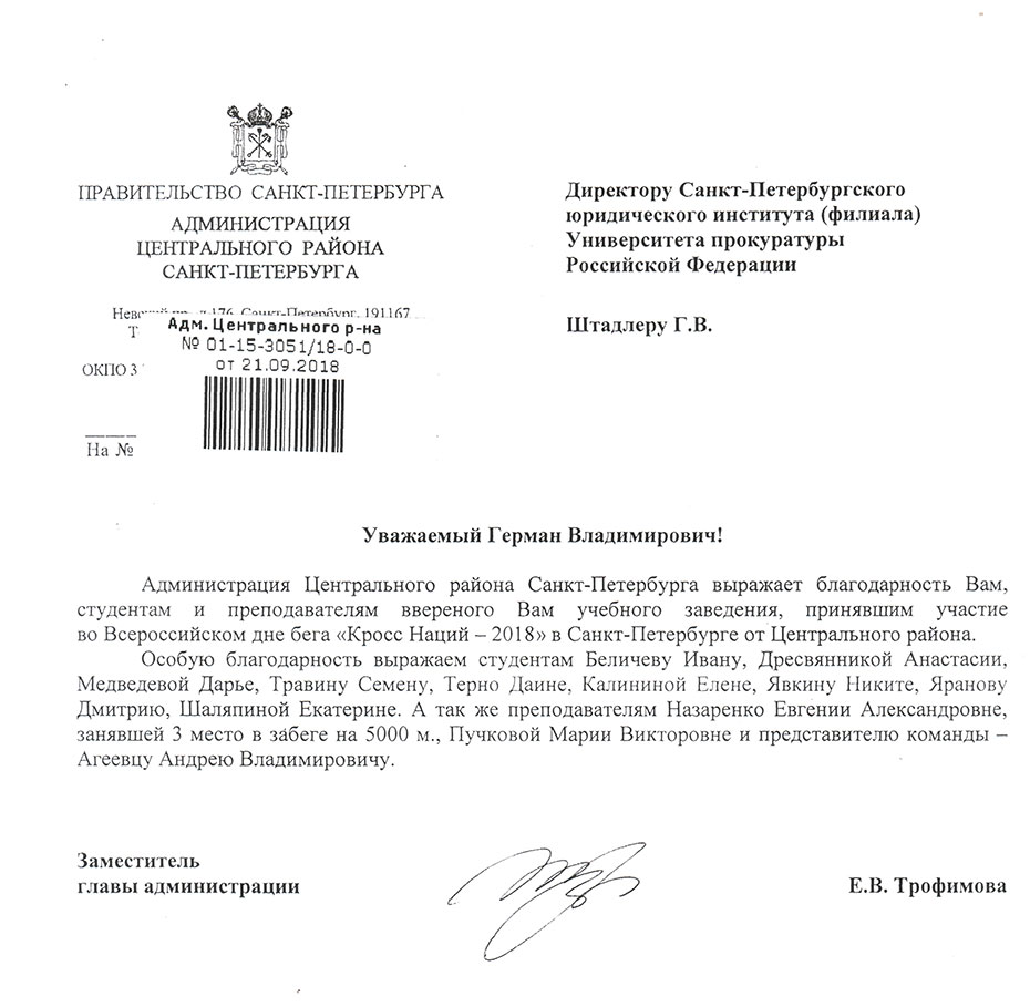 15 сентября 2018 года студенты юридического факультета Санкт-Петербургского филиала Университета прокуратуры Российской Федерации приняли участие в массовых соревнованиях по легкой атлетике «Кросс Нации – 2018». Соревнования проведены на Дворцовой площади Санкт-Петербурга. Участники преодолели дистанцию 5000 метров. Беговая трасса прошла через весь центр города: по Дворцовой площади, Дворцовому и Биржевому мостам, Кронверкской набережной, Троицкому мосту, Дворцовой набережной и Дворцовому проезду. В составе команды Института выступили: Беличев Иван, Дресвянникова Анастасия, Медведева Дарья, Травин Семен, Терно Диана, Калинина Елена, Явкин Никита, Шилова Наталья, Шаляпина Екатерина, Яранов Дмитрий и старшие преподаватели кафедры общегуманитарных и социально-экономических дисциплин Пучкова Мария Викторовна и Назаренко Евгения Александровна. Назаренко Е.А. заняла третье место в своей возрастной группе. Поздравляем призера соревнований и выражаем благодарность всем участникам соревнований, достойно представивших Институт.