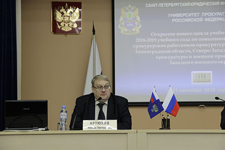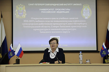 21 сентября 2018 года Санкт-Петербургским филиалом Университета прокуратуры Российской Федерации во взаимодействии с прокуратурами Санкт-Петербурга, Ленинградской области, Северо-Западной транспортной прокуратурой и военной прокуратурой Западного военного округа открыт 2018/2019 учебный год совместных учебно-методических семинаров в рамках повышения квалификации в системе органов прокуратуры. В занятиях приняли участие сотрудники прокуратур Санкт-Петербурга, Ленинградской области, Северо-Западной транспортной прокуратуры и военной прокуратуры Западного военного округа, осуществляющие надзор за процессуальной деятельностью в органах следствия и дознанием, обеспечивающие участие прокуроров в рассмотрении уголовных дел судами, в том числе не имеющие опыта следственной работы. Новый курс учебно-методических семинаров открыли и выступили с приветственными словами директор Санкт-Петербургского филиала Университета прокуратуры Российской Федерации государственный советник юстиции 2 класса Штадлер Г.В., первый заместитель прокурора Санкт-Петербурга государственный советник юстиции 3 класса Артюхов Э.Э., Врио военного прокурора Западного военного округа полковник юстиции Лабутин В.П., заместитель прокурора Ленинградской области государственный советник юстиции 3 класса Ерофеев В.П. Выступавшие отметили, что ставшая уже традиционной форма учебных занятий с прокурорскими работниками в виде проведения подобных ежемесячных учебных сборов, реализуется более 10 лет и, несомненно, положительно себя зарекомендовала, поскольку позволяет в оперативном режиме доводить до практических работников новеллы законодательства и современные исследования ведущих ученых в области юриспруденции, кроме того у слушателей имеется возможность в ходе дискуссий обмениваться своим уникальным правоприменительным опытом. Совместный План занятий на 2018/2019 учебный год сформирован на основании предложений прокуратур, участвующих в учебном процессе. При этом, к изучению и обсуждению предлагаются наряду с актуальными вопросами надзорной деятельности также наиболее сложные проблемы в сфере прокурорского надзора, осуществляемого транспортными и военными прокурорами. В ходе учебно-методического семинара перед аудиторией выступили профессора кафедры уголовного права, криминологии и уголовно-исполнительного права Любавина М.А. и Безбородов Д.А. по проблемам квалификации преступлений, предусмотренных ст.ст. 228-234 УК РФ и сложным вопросам квалификации преступлений против собственности. Об особенностях прокурорского надзора за осуществлением оперативно-розыскной деятельности в современных условиях рассказал профессор кафедры прокурорского надзора и участия прокуроров в рассмотрении уголовных, гражданских и арбитражных дел Никитин Е.Л. Заведующая кафедрой уголовного процесса и криминалистики Серова Е.Б., профессор кафедры Данилова Н.А. и доцент кафедры Баркалова Е.В. в своих выступлениях осветили следующие проблемные темы: «Научные методы познания, применяемые при анализе прокурором материалов уголовного дела»; «Особенности расследования и поддержания государственного обвинения по уголовным делам о преступлениях в сфере экономической деятельности, воспрепятствование законной предпринимательской или иной деятельности, незак