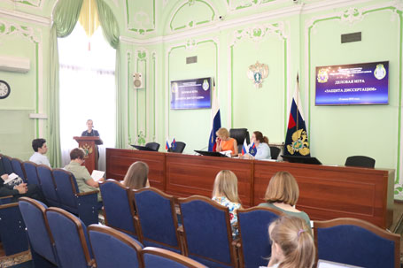 19 июня 2019 года в Санкт-Петербургском филиале Университета прокуратуры Российской Федерации Советом молодых ученых Института была организована и проведена деловая игра «Защита диссертации». Целью деловой игры «Защита диссертации» являлось развитие у аспирантов и магистрантов Санкт-Петербургского юридического института (филиала) Университета прокуратуры Российской Федерации умений и навыков, необходимых для предоставления и защиты диссертационного исследования на соискание ученой степени кандидата юридических наук и магистерского диссертационного исследования. В рамках данного научного мероприятия соискателем ученой степени кандидата юридических наук кафедры уголовного процесса и криминалистика Е.А. Кузьминой был представлено к публичной защите диссертационное исследование по теме «Рассмотрение прокурором и его участие в рассмотрении судом жалоб на действия и решения органов предварительного расследования». Деловая игра проведена в форме открытого заседания диссертационного совета, в состав которого вошли председатель диссертационного совета – доктор юридических наук, профессор Н.А. Данилова, члены диссертационного совета: доктор экономических наук Колесников В.В., доктор юридических наук Васильчикова Н.А., кандидат юридических наук О.А. Гуреева, кандидат юридических наук, доцент М.А. Григорьева, кандидат юридических наук А.И. Фролов, кандидат юридических наук Е.В. Баркалова, кандидат юридических наук Д.Ю. Краев, кандидат юридических наук Р.М. Кравченко и старший преподаватель Ю.М. Боброва, в качестве ученого секретаря диссертационного совета выступила аспирант А.В. Васильева. В заседании диссертационного совета также приняли участие: научный руководитель: В.С. Шадрин, доктор юридических наук, профессор; официальные оппоненты: Т.Г. Николаева, доктор юридических наук, профессор, В.А.Шиплюк, декан факультета профессиональной переподготовки и повышения квалификации, кандидат юридических наук, доцент. В деловой игре также принимали участие преподаватели и аспиранты Санкт-Петербургского юридического института (филиала) Университета прокуратуры Российской Федерации.