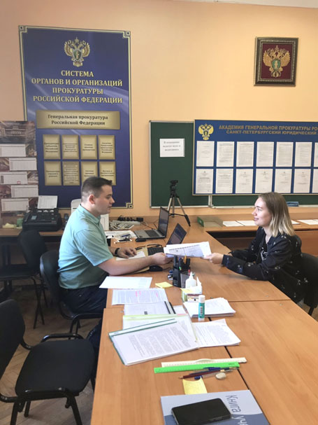 С 17 июня 2019 года приемной комиссией Университета прокуратуры Российской Федерации по Санкт-Петербургскому филиалу осуществляется прием документов от абитуриентов, поступающих для обучения по программам специалитета по специальности 40.05.04 Судебная и прокурорская деятельность и магистратуры по направлению подготовки 40.04.01 Юриспруденция. С информацией о правилах и ходе приема можно ознакомиться на сайте. В соответствии с разнарядкой целевых мест Санкт-Петербургскому филиалу Университета прокуратуры Российской Федерации в 2019 году выделено 100 мест для приема по программе специалитета 40.05.04 Судебная и прокурорская деятельность, распределенных между 48 прокуратурами субъектов Российской Федерации и приравненными к ним специализированными прокуратурами. 01 июля 2019 года в приемную комиссию поступило первое личное дело и документы от абитуриента, имеющего целевое направление от прокуратуры Брянской области.
