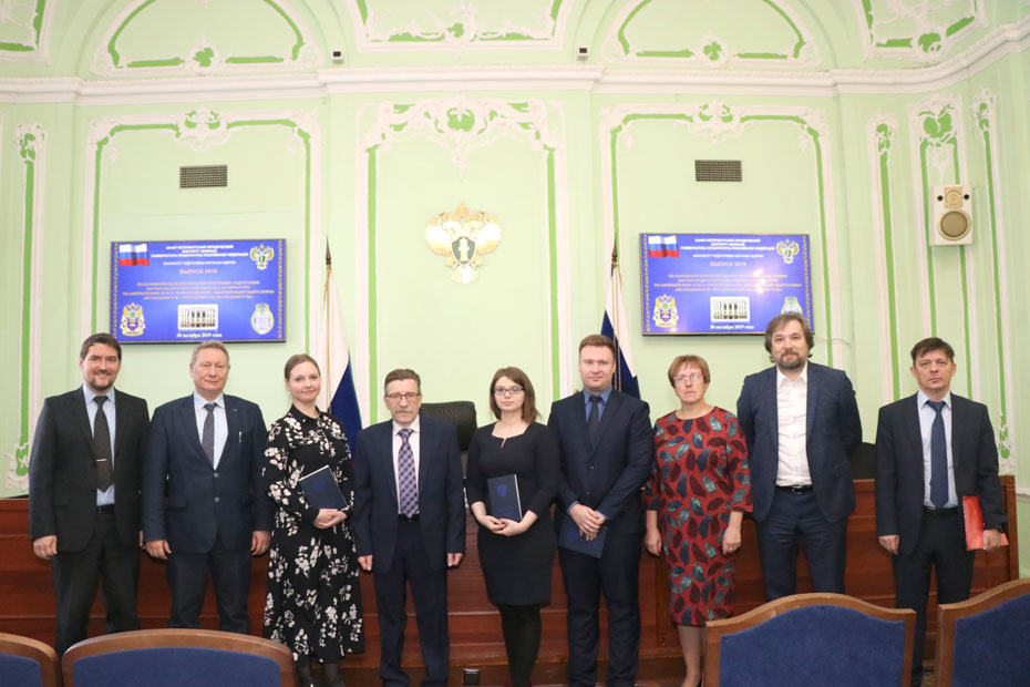 30 октября 2019 г. в Санкт-Петербургском юридическом институте (филиале) Университета прокуратуры Российской Федерации состоялось торжественное вручение дипломов об окончании аспирантуры выпускникам очной и заочной форм обучения факультета подготовки научных кадров. В соответствии с приказом ректора Университета от 21.10.2019 № 452 аспирантам Ильиной А.Н., Кузьминой Е.А. и Таратонову И.И., успешно прошедшим государственную итоговую аттестацию, присвоена квалификация «Исследователь. Преподаватель-исследователь» по направлению подготовки 40.06.01 Юриспруденция. В мероприятии приняли участие аспиранты очной и заочной форм обучения, преподаватели Института. И.о. директора Института Сальников А.В. поздравил выпускников, пожелав им личного и профессионального роста, а также успешной защиты диссертации на соискание ученой степени кандидата наук. Дипломы об окончании аспирантуры выпускникам вручил заместитель директора Санкт-Петербургского юридического института (филиала) Университета прокуратуры Российской Федерации Сапожков А.А. От имени выпускников аспирант Кузьмина Е.А. выразила слова благодарности профессорско-преподавательскому составу и руководству Института.