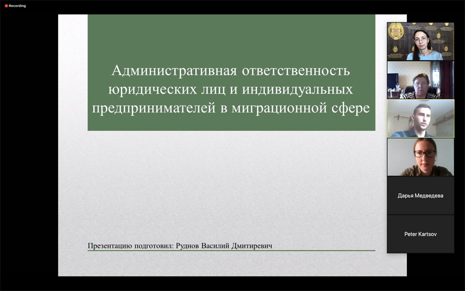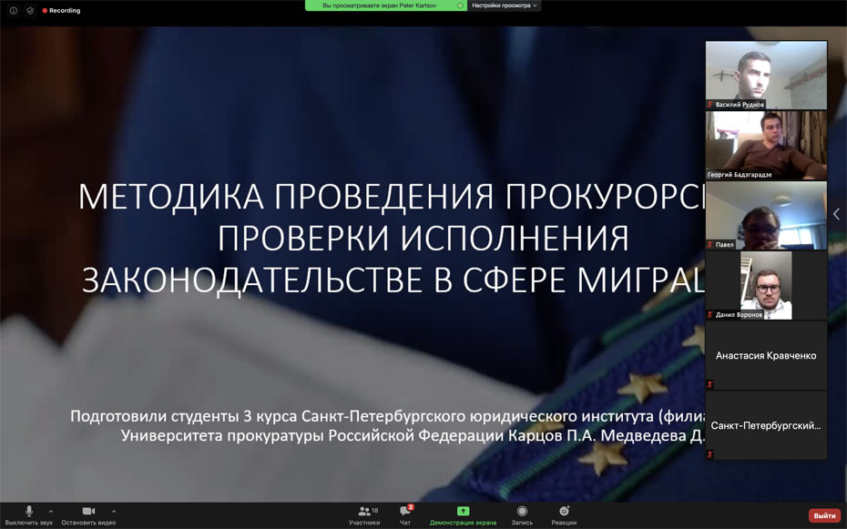 20 мая 2020 г. состоялось очередное заседание СНК «Актуальные вопросы прокурорской деятельности» с использованием платформы ZOOM. Главной темой обсуждения стали вопросы обеспечения законности в миграционной сфере. В докладах, с которыми выступили студенты Санкт-Петербургского института (филиала) ВГЮУ (РПА Минюста России), нашли отражение актуальные вопросы административной и уголовной ответственности за нарушения в миграционной сфере, рассматривалась международная практика, освещены правовые позиции Конституционного суда РФ. От СПбЮИ (ф) Университета прокуратуры РФ с докладом выступили студенты 3 курса Карцов Пётр и Медведева Дарья, которые осветили особенности методики проведения проверки исполнения законодательства в сфере миграции. Заседание организовано доцентом кафедры прокурорского надзора и участия прокурора в рассмотрении уголовных, гражданских и арбитражных дел, кандидатом юридических наук, советником юстиции Исламовой Эльнарой Рафисовной и доцентом кафедры уголовного права и процесса, кандидатом юридических наук, доцентом Санкт-Петербургского института (филиала) ВГЮУ (РПА Минюста России) Кристиной Александровной Красновой, осуществлявшими научное руководство подготовкой докладов студентов. Экспертом по вопросам заседания выступила заведующий кафедрой СПбЮИ (ф) Университета прокуратуры РФ, доктор юридических наук, профессор, старший советник юстиции, заслуженный работник прокуратуры Российской Федерации, почетный работник прокуратуры Российской Федерации Коршунова Ольга Николаевна. Представленные доклады вызвали оживленную дискуссию, в ходе которой была приведена судебная практика из различных регионов России, а также международная практика. Участники мероприятия выражают надежду на дальнейшее сотрудничество в научной сфере.
