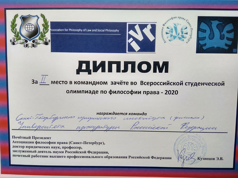 02 июля 2020 г. подведены итоги Всероссийской студенческой олимпиады по философии права – 2020, в которой приняли участие две команды студентов 1 курса Санкт-Петербургского филиала Университета прокуратуры Российской Федерации. Команда 1: Команда 2: В Олимпиаде также приняли участие студенты Новгородского государственного университета имени Ярослава Мудрого, Северо-Западного Филиала Российского государственного университета правосудия, Санкт-Петербургского государственный университета аэрокосмического приборостроения, Санкт-Петербургской юридической академии, Санкт-Петербургского университета МВД России, студенты и других ВУЗов. В связи со сложной эпидемиологической обстановкой, в целях предупреждения распространения новой коронавирусной инфекции (COVID-19) в 2020 году Олимпиада проведена в заочной форме, исключающей личное присутствие участников Олимпиады. В командном зачёте Олимпиады команда Института заняла призовое 2 место. В личном зачёте 2 место заняла Лукашенко Полина и 3 место занял Столярский Егор.