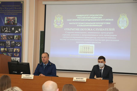28 октября 2020 года на факультете профессиональной переподготовки и повышения квалификации Санкт-Петербургского филиала Университета прокуратуры Российской Федерации состоялось открытие потока слушателей, проходящих обучение по программе повышения квалификации старших помощников, помощников прокуроров городов, районов и приравненных к ним прокуроров специализированных прокуратур, осуществляющих надзор за исполнением законодательства при реализации национальных проектов. Со вступительным словом перед слушателями, прибывшими для обучения в Санкт-Петербургский филиал Университета прокуратуры Российской Федерации, выступил заместитель директора Института государственный советник юстиции 3 класса Короп А.Б., довел до аудитории основные требования, предъявляемые Генеральной прокуратурой России к повышению квалификации прокурорских работников, поставил задачи неукоснительного соблюдения требований учебного плана и дисциплины при нахождении в служебной командировке, а также мер по профилактике новой коронавирусной инфекции (COVID-19). Отметил необходимость постоянного совершенствования профессиональных навыков прокурорских работников в условиях изменяющегося законодательства Российской Федерации. Обозначил необходимость системной работы прокуроров по выявлению и пресечению нарушений закона при реализации национальных проектов. Декан факультета профессиональной переподготовки и повышения квалификации Шиплюк В.А. осветил особенности прохождения обучения по программе повышения квалификации в Институте и формах промежуточного и итогового контроля.