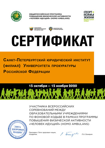 30 ноября 2020 года подведены итоги общероссийского соревнования по фоновой ходьбе «Человек идущий», в которой приняли участие студенты Санкт-Петербургского филиала Университета прокуратуры Российской Федерации. Организатором соревнования является Общероссийская общественная организация «Лига здоровья нации» при поддержке Министерства спорта РФ. Чемпионат проходил в рамках федерального проекта «Спорт – норма жизни». Санкт-Петербургский филиал Университета прокуратуры Российской Федерации был представлен в категории «Образовательных учреждений» двумя командами: «Литейный,44» и «Прокуроры» в количестве 70-ти человек. В состав команд вошли студенты юридического факультета 1, 2, 3 курса специалитета, 4 курса бакалавриата и научно – педагогические работники института. В категории «Образовательных учреждений» приняло участия 130 команд и команда «Литейный, 44» заняла 3 место среди команд от Санкт – Петербурга! Команда «Прокуроры» - заняла 4 место среди заявленных команд от Санкт – Петербурга! Поздравляем участников и желаем им ещё не один раз суметь доказать силу своего духа! |