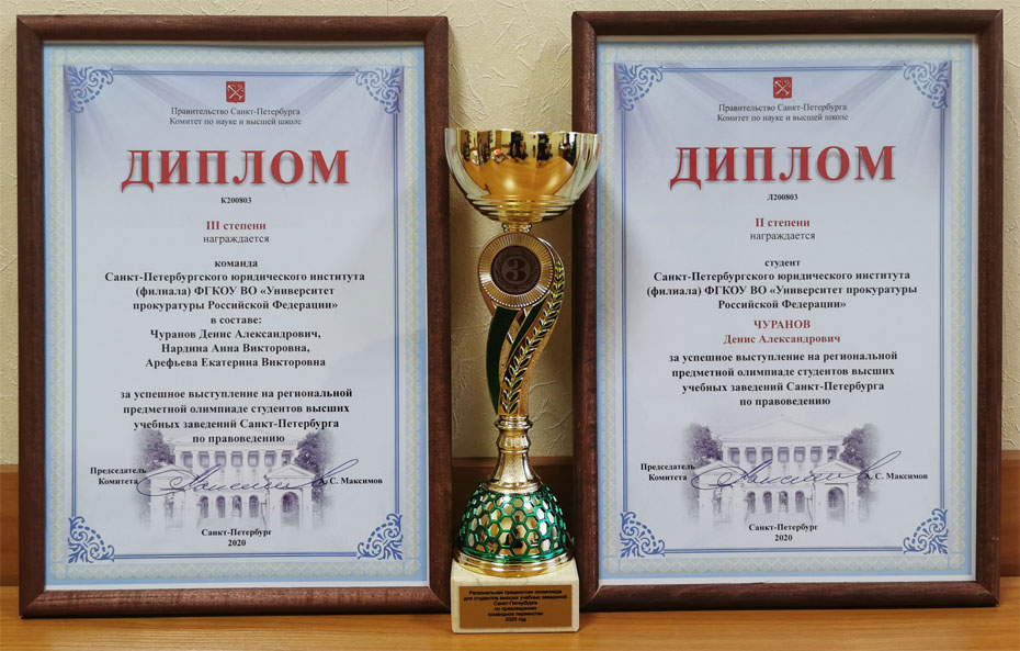 Подведены итоги региональной предметной олимпиады студентов высших учебных заведений Санкт-Петербурга по дисциплине «Правоведение» (тематика «Уголовное право»). Предметная студенческая олимпиада проводилась в дистанционном формате в Санкт-Петербургском государственном экономическом университете 29 октября 2020 г. В олимпиаде приняли участие 63 студента (11 команд) из 12 вузов Санкт-Петербурга. Результаты вузов-участников в командном зачете формировались по трем лучшим результатам студентов-участников от вуза. Наш институт представляла команда в составе: Чуранов Денис, Нардина Анна, Арефьева Екатерина и Баканова Яна. В личном зачете Чуранов Денис занял 2 место, а команда заняла 3 место в командном зачете. Поздравляем команду института с победой в региональной предметной олимпиаде студентов высших учебных заведений Санкт-Петербурга по дисциплине «Правоведение» (тематика «Уголовное право»).
