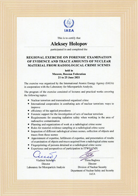 21-25 июня 2021 года заведующий криминалистической лаборатории Санкт-Петербургского филиала Университета прокуратуры Российской Федерации принял участие в региональных учениях по судебной экспертизе вещественных доказательств и следовых количеств ядерного материала с места радиологических преступлений, проводимых МАГАТЭ (Международное агентство по атомной энергии) и лабораторией анализа микрочастиц на базе института теоретической и экспериментальной физики имени А. И. Алиханова г. Москва. Работа учений осуществлялась по следующим направлениям: Ядерный терроризм и транснациональная организованная преступность. Международное сотрудничество в борьбе с актами ядерного терроризма: пути совершенствования. Судебно-медицинское сопровождение расследования актов ядерного терроризма. Требования по обеспечению радиационной безопасности при работе в зоне радиоактивного загрязнения. Планирование и организация работы на месте радиологического преступления. Правила отбора вещественных доказательств на месте радиологического преступления. Осмотр различных мест радиологических преступлений, сбор предметов и следов с этих мест. Назначение экспертизы, проведение экспертизы и представление результатов осмотра предметов и следов, полученных с места радиологического преступления. Снятие отпечатков пальцев лиц, задержанных на месте радиологического преступления. С докладом «Криминалистическое обеспечение расследования актов ядерного терроризма» выступил заведующий криминалистической лабораторией Института к.ю.н., доцент, А. В. Холопов.