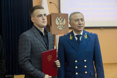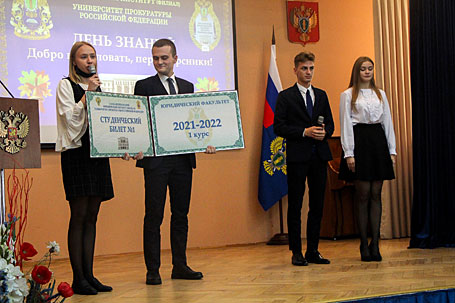 1 сентября 2021 года в Санкт-Петербургском филиале Университета прокуратуры Российской Федерации состоялось торжественное собрание, посвящённое Дню знаний и началу обучения студентов 1 курса программ специалитета и магистратуры набора 2021 года. Директор Института, доктор юридических наук, профессор Спиридонов А.П. поздравил с поступлением в Университет и началом студенческой жизни всех вновь принятых студентов, пожелал успехов в освоении учебной программы, научных и творческих достижений. Оглашена поздравительная телеграмма с Днём знаний и началом нового учебного года ректора Университета прокуратуры Российской Федерации доктора юридических наук, профессора Капинус О.С. В торжественной обстановке был оглашен приказ Генерального прокурора Российской Федерации Краснова И.В. о назначении студентам юридического факультета Института именных стипендий Генерального прокурора Российской Федерации на 2021/22 учебный год. Директор Института Спиридонов А.П. вручил студентам Богданову Никите, Сунгатуллиной Айгуль Ильшатовне, Чуранову Денису, Якимчук Екатерине соответствующий приказ Генерального прокурора России. По сложившейся традиции студенты выпускного курса вручили первокурсникам переходящий символический студенческий билет №1, 2021/22 учебного года. С напутственным словом к первокурсникам обратились студенты 1 курса магистратуры Тимофеева Елизавета и Демидов Сергей, с ответным словом и клятвой выступили студенты 1 курса Чернышева Снежана и Пайст Максим. Творческими номерами с Днём знаний всех присутствующих поздравили студенты юридического факультета Кострыкин Данила прочёл стихотворение Юрия Козлова «Блистательный Санкт-Петербург», Убушиева Виктория и Дорджиев Игорь исполнили национальный калмыцкий танец, Сынков Владимир исполнил песню на стихи Михаила Пляцковского музыку Серафима Туликова «Не повторяется такое никогда». В завершении мероприятия состоялось памятное фотографирование.