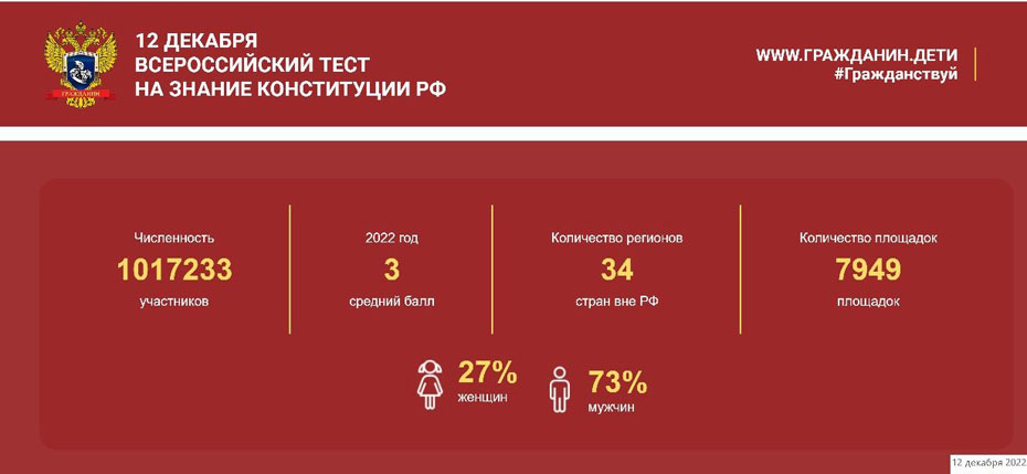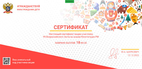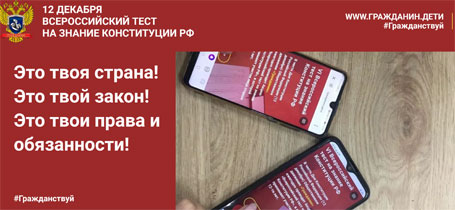 Ежегодно 12 декабря в честь Дня Конституции Российской Федерации общественное движение «Гражданин» при поддержке федеральных законодательных и исполнительных органов власти субъектов Российской Федерации, средств массовой информации, образовательных и общественных организаций проводит Акцию «Всероссийский тест на знание Конституции Российской Федерации» для оценки уровня правовой грамотности россиян, а также для мотивации общества к изучению гражданского строя Российской Федерации и выполнению конституционных обязанностей, привлечения внимания органов государственной власти, общественных организаций и средств массовой информации к сохранению основополагающих принципов конституционного строя России. В 2022 году 1 017 233 участника на 7949 площадках проверяли свои знаия Конституции России. 19 студентов 301 группы юридического факультета Санкт-Петербургского филиала Университета прокуратуры Российской Федерации ответили в онлайн-формате на вопросы теста. Наиболее отличившиеся студенты - Багаев Максим, Засеев Заурбек, Мантулов Ярослав, Красовская Елена, Ильичева Екатерина и Папина Юлия. Все участники получили сертификаты участника VII Всероссийского теста на знание Конституции Российской Федерации.