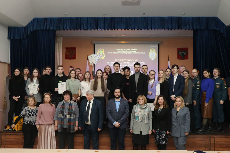 28 февраля 2023 года в Санкт-Петербургском филиале Университета прокуратуры Российской Федерации состоялась III Межвузовская студенческая олимпиада по иностранному языку в сфере юриспруденции. Олимпиада была проведена кафедрой общегуманитарных и социально-экономических дисциплин. В мероприятии приняло участие более 60 студентов в составе 13 команд. Олимпиада состояла из «Домашнего задания», в рамках которого студенты должны были подготовить ответы на поставленные вопросы по материалу судебного дела, а также выполнить во время олимпиады ряд заданий и тестов. Участники успешно справились с поставленными перед ними задачами. По результатам конкурсных испытаний призовые места распределились следующим образом: I место заняла команда “Ace Attorney” из Санкт-Петербургского государственного экономического университета в составе Абрамовой Меланьи, Гармаш Дарьи, Гусаренко Марии, Шишковой Дарьи, Огородниковой Ксении. II место завоевала команда «Прокурорские знатоки» из Санкт-Петербургского юридического института (филиала) Университета прокуратуры Российской Федерации в составе Бисултановой Миланы, Воронкина Даниила, Джаббарова Агарзы, Климова Артура, Терехова Надежды. III место было присуждено команде “Risky Rescuers” Санкт-Петербургского университета ГПС МЧС России в составе Сомовой Кристины, Кравец Карины, Фомичевой Таи, Бур Алины, Мельникова Якова, Смирониной Эльвиры. Победители были награждены почетными грамотами, всем участвовавшим в Олимпиаде были вручены сертификаты. Поздравляем победителей, благодарим всех за участие и надеемся на дальнейшее плодотворное сотрудничество.