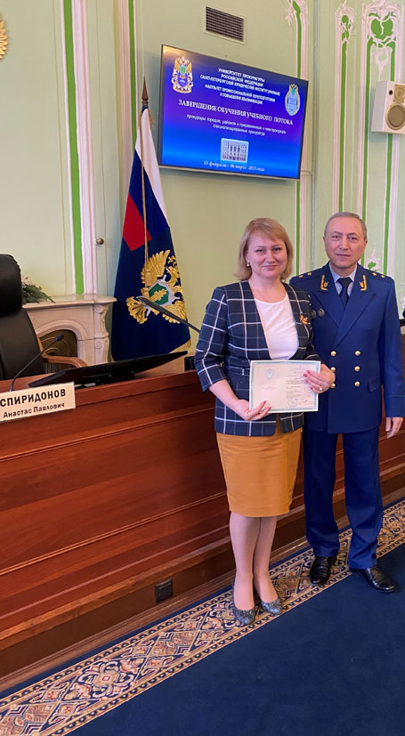 6 марта 2023 года в Санкт-Петербургском юридическом институте (филиале) Университета прокуратуры Российской Федерации завершилось обучение слушателей по программе повышения квалификации прокуроров городов, районов и приравненных к ним прокуроров специализированных прокуратур. Удостоверения о повышении квалификации вручил директор Института государственный советник юстиции 2 класса Спиридонов А.П.