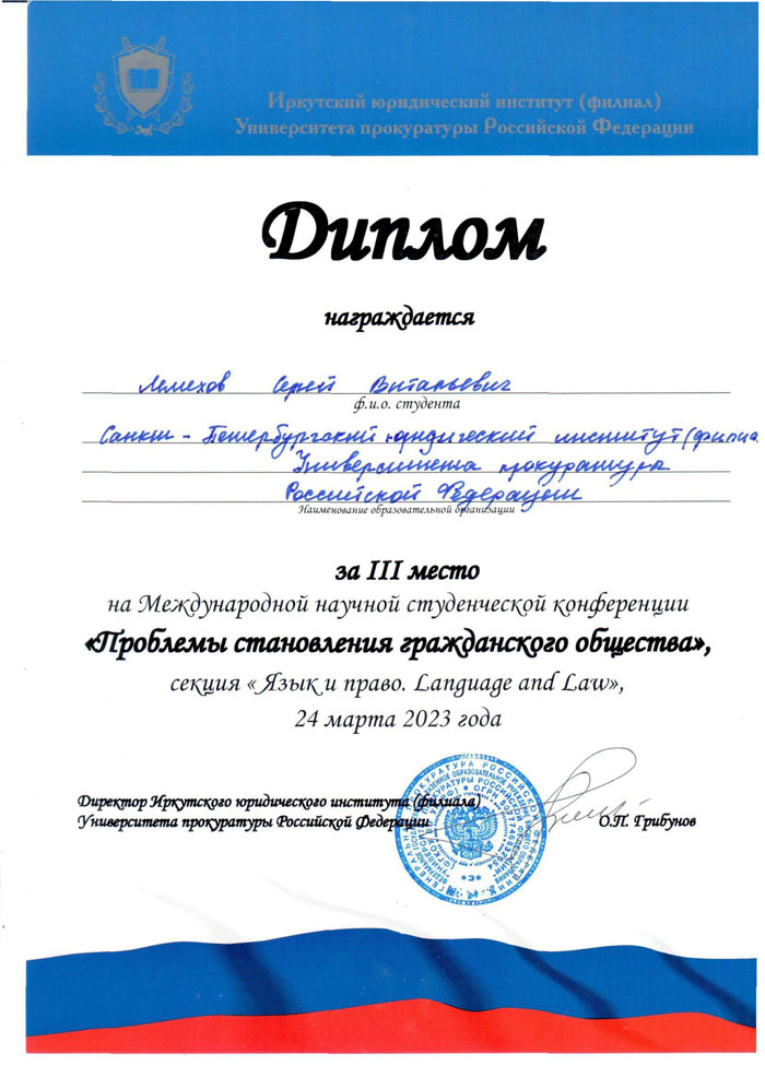 24 марта 2023 года в Иркутском юридическом филиале Университета прокуратуры Российской Федерации состоялась Международная научная студенческая конференция «Проблемы становления гражданского общества». В мероприятии приняли участие студенты (курсанты), магистранты и аспиранты (адъюнкты) образовательных организаций высшего образования России, государств-участников СНГ, Монголии. Работа конференции была организована по следующим секциям: - Теория и история государства и права, история политических и правовых учений; - Публичное право; - Частное право; - Уголовное право; - Прокурорский надзор; - Уголовный процесс и криминалистика; - Язык и право. Language and Law. По итогам работы секции «Язык и право. Language and Law» студент 5 курса Института Лемехов Сергей Витальевич награжден дипломом III степени за выступление с докладом «К вопросу о привлечении переводчика для регулирования трудовых отношений иностранных работников», научный руководитель − заведующий кафедрой общегуманитарных и социально-экономических дисциплин, кандидат филологических наук Синявская Светлана Павловна. Поздравляем студента Института и желаем дальнейших научных успехов!
