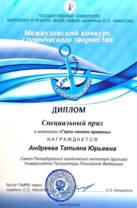 2 мая 2023 года были объявлены итоги конкурса «Серебряный якорь», организованного Государственным университетом морского и речного флота имени адмирала С.О. Макарова. Студентка 2 курса юридического факультета Санкт-Петербургского филиала Университета прокуратуры Российской Федерации Андреева Татьяна приняла участие в конкурсе с песней в номинации «Герои нашего времени». После подведения итогов Андреева Татьяна награждена дипломом «Специальный приз». Студенческий совет благодарит Татьяну за участие и желает ей дальнейших успехов на творческом поприще!