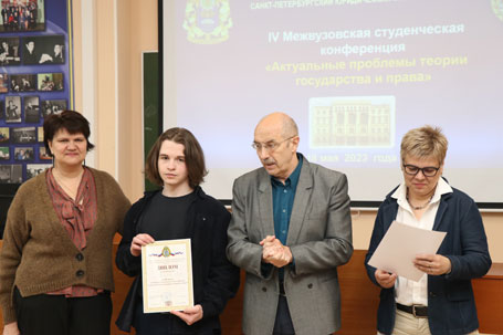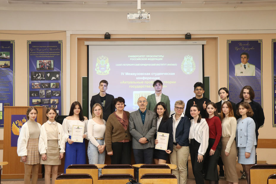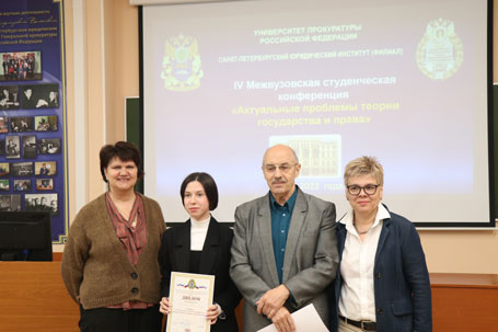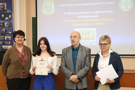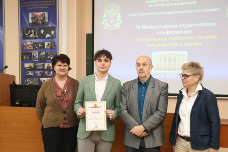 18 мая 2023 г. в Санкт-Петербургском филиале Университета прокуратуры Российской Федерации проведена IV Межвузовская студенческая научная конференция «Современные проблемы правопонимания», организованная кафедрой теории и истории государства и права, Студенческим научным обществом Института и студенческим научным кружком «Правовед». В работе конференции приняли участие студенты следующих высших учебных заведений: Санкт-Петербургского государственного университета аэрокосмического приборостроения, Северо-Западного филиала Российского государственного университета правосудия, Санкт-Петербургского филиала Университета прокуратуры Российской Федерации. Жюри в составе: профессора кафедры теории и истории государства и права доктора юридических наук, профессора, заслуженного юриста РФ И.Л. Честнова (председателя); заведующего кафедрой, кандидата юридических наук, Е.Е. Амплеевой; профессора кафедры, доктора юридических наук, И.Б. Ломакиной; доцента кафедры кандидата юридических наук, Н.М. Ивановой, изучив и оценив представленные работы, с точки зрения творческого подхода к раскрытию темы, связи правопонимания с практическими проблемами юриспруденции, присудило: Первое место – студентке Санкт-Петербургского филиала Университета прокуратуры Российской Федерации Донецкой А.Д. Второе место разделили студентка Санкт-Петербургского филиала Университета прокуратуры Российской Федерации Синицына В.А. и студентка Санкт-Петербургского государственного университета аэрокосмического приборостроения Шемонаева А.И. Третье место разделили студент Северо-Западного филиала Российского государственного университета правосудия Гулин С.А. и студент Санкт-Петербургского государственного университета аэрокосмического приборостроения Дубровский Д.А. Благодарим всех участников и поздравляем победителей! Желаем всем дальнейших успехов в научной деятельности!