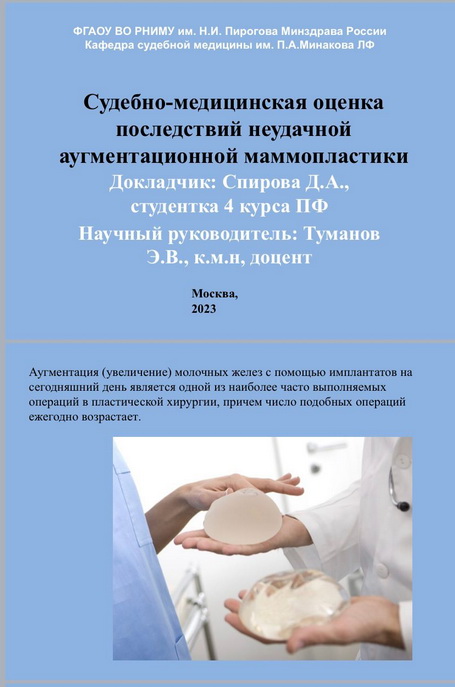 «Судебно-медицинская оценка негативных последствий маммопластики» (Спирова Д. А., Российский Национальный Исследовательский Медицинский Университет им. Пирогова);