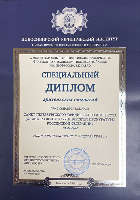 Студенты Санкт-Петербургского филиала Университета прокуратуры Российской Федерации стали призерами Международного фестиваля фильмов по криминалистике «Золотой след» им. профессора В.К. Гавло. 20-21 апреля 2023 года в Новосибирском юридическом институте (филиале) Томского государственного университета в заочном формате проведен X юбилейный Международный кинофестиваль студенческих фильмов по криминалистике им. профессора В.К. Гавло. Студентки 402 группы, члены студенческого научного кружка «Криминалистика» Онучина Софья, Полякова Ольга, Грибанова Юлия, Зуева Елизавета, Чикарева Дарья, Морозова Варвара под руководством доцента кафедры уголовного процесса и криминалистики, кандидата юридических наук, доцента Григорьевой Марии Александровны подготовили и направили на конкурс видеофильм «Однажды на допросе у следователя…». Итоги конкурса подведены 22 мая 2023 года. Видеофильм «Однажды на допросе у следователя…» награжден специальным дипломом зрительский симпатий. Поздравляем с наградой! Желаем дальнейших научных и творческих успехов!