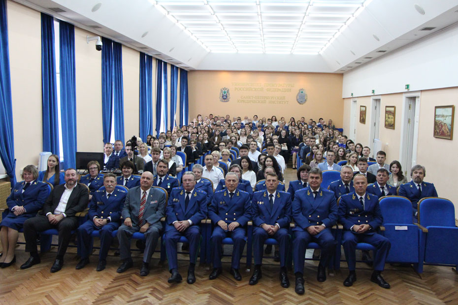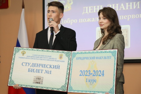 1 сентября 2023 года в Санкт-Петербургском филиале Университета прокуратуры Российской Федерации состоялось торжественное собрание, посвящённое Дню знаний и началу обучения студентов 1 курса программы специалитета набора 2023 года. В торжественном собрании приняли участие почётные гости В.Д. Мельник, прокурор Санкт-Петербурга, В.А. Владимиров, Северо-Западный транспортный прокурор, А.М. Дворянский, ветеран прокуратуры. Директор Института, доктор юридических наук, профессор А.П. Спиридонов поздравил с поступлением в Университет и началом студенческой жизни всех вновь принятых студентов, пожелал успехов в освоении учебной программы, научных и творческих достижений. Отметил, что число первокурсников Института впервые пополнили иностранные студенты из Кыргызской Республики и Республики Южная Осетия. На мероприятии был оглашен приказ Генерального прокурора Российской Федерации Краснова И.В. о назначении студентам юридического факультета Института именных стипендий Генерального прокурора Российской Федерации на 2023/24 учебный год - Онучиной Софье, Головиной Лидии, Сарапкину Владимиру, Рогановой Дарье и Лихомановой Яне. А также были вручены поощрения ректора Университета победителям и призёрам конкурса «Лучшая выпускная работа»: в номинации «Лучшая дипломная работа» Горбачу Виктору (научный руководитель Григорьева Мария Александровна); в номинации «Лучшая магистерская диссертация» Перевезенцевой Наталье (научный руководитель Лавров Вениамин Владимирович) и приказ директора Института, которым объявлена благодарность студентам Института Дорджиеву Игорю, Комиссарову Роману, Лукину Артему и Цапенко Василию. Первокурсникам в торжественной обстановке почетными гостями и руководством Института были вручены студенческие билеты. По сложившейся традиции студенты выпускного курса Ершова Полина и Храмков Иван вручили первокурсникам переходящий символический студенческий билет номер 1 2023/2024 учебного года. Творческими номерами с Днём знаний присутствующих поздравили студенты юридического факультета Эпов Иван, Николаева Люба, Косенкова Анна, Иванова Александра и студенческая театральная студия. В завершении мероприятия состоялось памятное фотографирование.