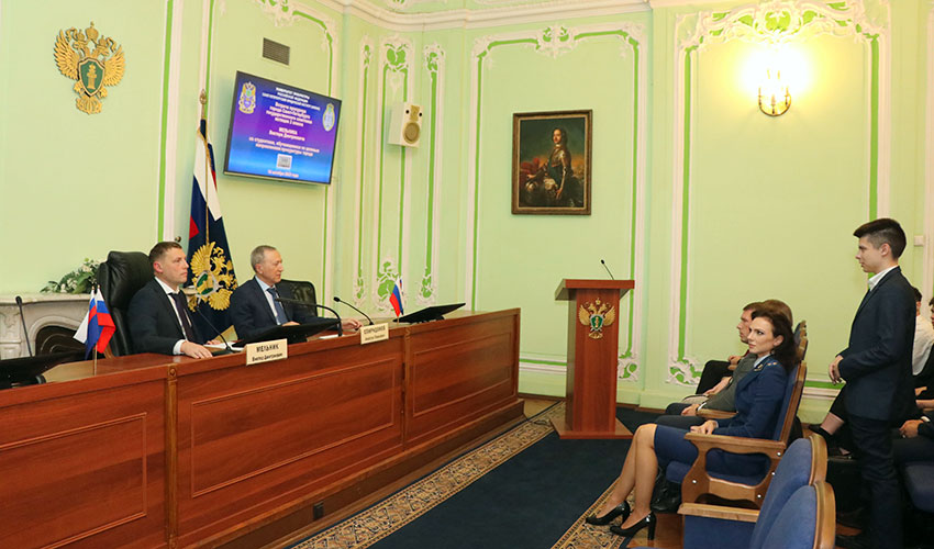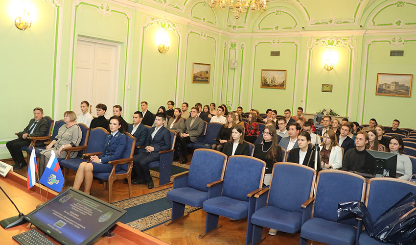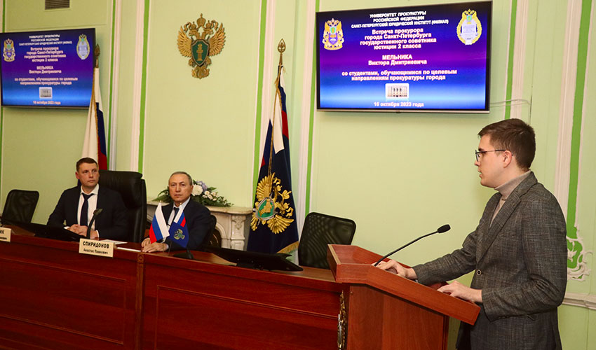 16 октября 2023 г. в Санкт-Петербургском филиале Университета прокуратуры Российской Федерации состоялась уже ставшая традиционной встреча прокурора Санкт-Петербурга государственного советника юстиции 2 класса Мельника Виктора Дмитриевича со студентами юридического факультета Института, проходящими обучение по целевым направлениям прокуратуры Санкт-Петербурга. Во встрече приняли участие директор института Спиридонов Анастас Павлович, заместитель директора института Сальников Алексей Валентинович, начальник отдела кадров прокуратуры Алексеева Юлиана Борисовна, представитель Министерства обороны Российской Федерации и декан юридического факультета Севастьяник Ирина Клавдиевна. В ходе встречи Мельник В.Д. рассказал об основных направлениях работы прокуратуры на современном этапе и результатах этой работы, привел интересные примеры из практики. Напутственные слова для будущих прокуроров прозвучали от директора института Спиридонова А.П. Представитель Министерства обороны Российской Федерации обратил внимание на важность патриотического воспитания в современных условиях. Студент 3 курса Глуздак Г.Н. рассказал, как проходил практику в прокуратуре и что нового узнал в процессе ее прохождения. В завершение встречи Мельник В.Д. ответил на вопросы студентов. |