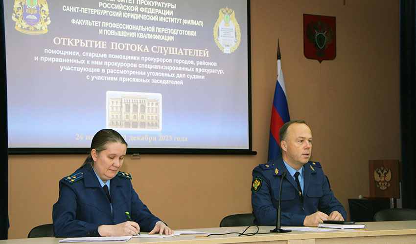 24 ноября 2023 года в Санкт-Петербургском юридическом институте (филиале) Университета прокуратуры Российской Федерации состоялось открытие потока слушателей, проходящих обучение по программе повышения квалификации помощников, старших помощников прокуроров городов, районов и приравненных к ним прокуроров специализированных прокуратур, участвующих в рассмотрении уголовных дел судами с участием присяжных заседателей. Со вступительным словом выступил заместитель директора Института государственный советник юстиции 3 класса Короп А.Б., довел до аудитории основные требования, предъявляемые Генеральной прокуратурой Российской Федерации, поставил задачи строгого соблюдения требований учебного плана и дисциплины. Освещены вопросы воспитательно-патриотической работы с потоком и запланированные мероприятия. Было обращено внимание на подборку учебных изданий по тематике потока в библиотеке Института. Декан факультета профессиональной переподготовки и повышения квалификации Головко И.И. рассказала об особенностях обучения по программе повышения квалификации, сроки и формы промежуточного и итогового контроля. |
