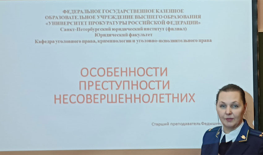 23 ноября 2023 года в рамках проведения мероприятий, приуроченных к Всероссийскому дню правовой помощи детям, старшим преподавателем кафедры уголовного права, криминологии и уголовно-исполнительного права Федышиной П. В. для воспитанников Санкт-Петербургского центра для детей-сирот и детей, оставшихся без попечения родителей, "Центр содействия семейному воспитанию №6" была проведена лекция "Особенности преступности несовершеннолетних".