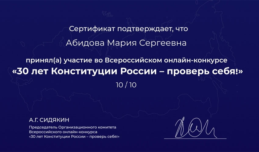 30 ноября 2023 г. студенты Патриотического клуба Санкт-Петербургского филиала Университета прокуратуры Российской Федерации совместно с курсантами Санкт-Петербургского военного ордена Жукова институтом войск Национальной гвардии приняли участие во Всероссийском онлайн-конкурсе «30 лет Конституции России - проверь себя». Все участники продемонстрировали достойные знания Конституционного права, и были отмечены сертификатами! Благодарим ребят за участие! |