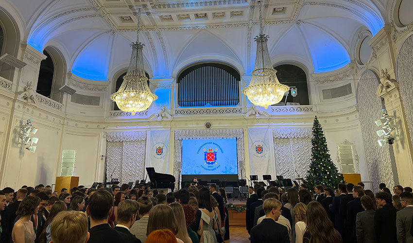 21 декабря 2023 г. в Белом зале Санкт-Петербургского политехнического университета имени Петра Великого прошел VIII Губернаторский новогодний студенческий бал. В числе участников – победители различных конкурсов, предметных олимпиад, получатели грантов и стипендий, всего более 700 студентов, отличившихся в научной, творческой, общественной деятельности и спорте. Наш институт представляли студенты 5 курса Ершова Полина и Храмков Иван. Открыл праздник председатель Комитета по науке и высшей школе Правительства Санкт-Петербурга Андрей Максимов. В программе бала были танцевальный променад, знакомство с танцами петербургских балов XIX-XX веков, интерактивные цифровые развлечения. |