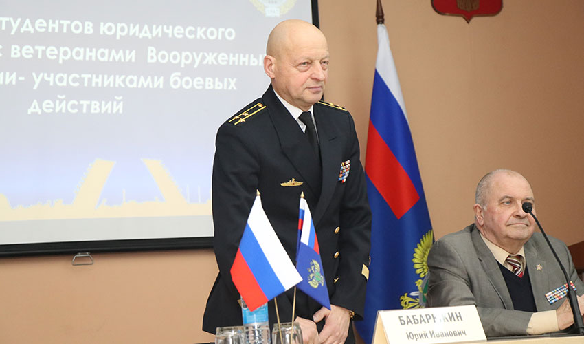 14 февраля 2024 года в Институте состоялась встреча студентов и работников Института с ветеранами Вооруженных Сил Российской Федерации - участниками боевых действий. Встреча была организована Советом ветеранов Института. В мероприятии приняли участие капитан 1 ранга Бабарыкин Юрий Иванович и контр-адмирал Лупач Леонид Захарович. Мероприятие открыл председатель Совета ветеранов Дворянский Александр Михайлович, который рассказал об истории праздника «День защитника Отечества». Встреча продолжилась выступлениями Бабарыкина Ю. и Лупача Л.З., которые поделились воспоминаниями о прохождении военной службы, рассказали о своем участии в боевых действиях и ответили на вопросы, пожелав всем мира, стабильности и успехов в профессиональной деятельности.