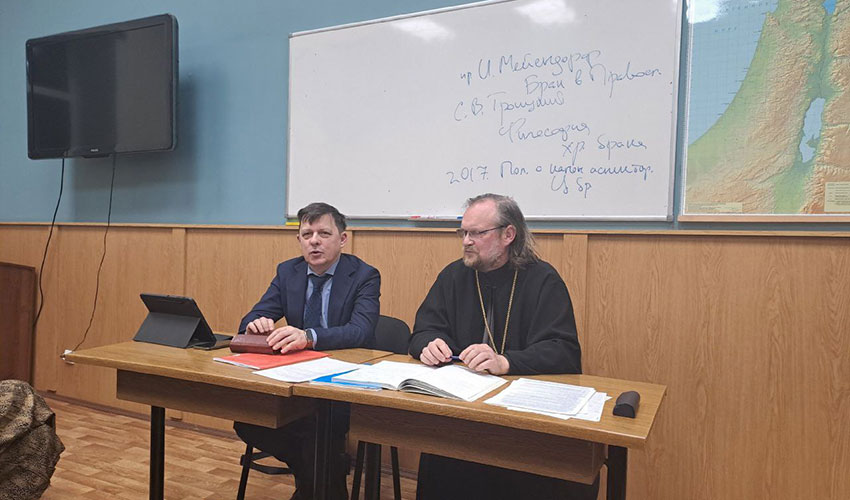 01 марта 2024 года студенты Патриотического клуба и преподаватели Санкт-Петербургского филиала Университета прокуратуры Российской Федерации совместно со студентами Санкт-Петербургской Духовной академии организовали проведение круглого стола, посвященного теме «Семья и брак». Указом Президента Российской Федерации от 22.11.2023 № 875 «О проведении в Российской Федерации Года семьи» в целях популяризации государственной политики в сфере защиты семьи, сохранения традиционных семейных ценностей 2024 год признан годом семьи. - Лавров Вениамин Владимирович, заведующий кафедрой государственно-правовых дисциплин Санкт-Петербургского филиала Университета прокуратуры Российской Федерации, кандидат исторических наук, кандидат юридических наук; - протоиерей Алексий Балакай, преподаватель «Канонического права» Санкт-Петербургской Духовной Академии. Выступая перед слушателями, В.В. Лавров рассказал о новеллах семейного права, закреплённых в Конституции Российской Федерации, особое внимание уделив институту брака, как союзу мужчины и женщины, порядку и условиям заключения брака в органах ЗАГСа, процедуре признания брака недействительным, мерам социальной поддержки семьям на государственном уровне. Кроме того, В.В. Лавров проанализировал исторический опыт заключения, удостоверения и регистрации семейных отношений на протяжении всего существования Российского государства. Протоиерей Алексий Балакай рассказал о христианском понимании любви, таинстве венчания, ответственном отношении к выбору спутника жизни. Приведена метафора, позволяющая понять верный выбор супруга, «два уголька, если вместе, то пылают, а по отдельности погаснут». Студентам было предложено ознакомиться с книгами И. Мейендорфа «Брак в православии», С. В. Троицкий «Философия христианского брака». Таким образом, на встрече проанализировано церковное (каноническое) и светское законодательство о семейных взаимоотношениях. Сделан вывод о том, что «счастье в семье наступает тогда, когда каждый научится отдавать больше, нежели получать». Благодарим организаторов, лекторов и слушателей за встречу! И помним: «Слова учат, а лишь поступки влекут».