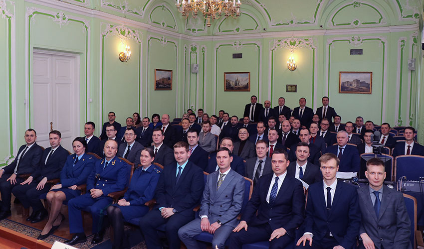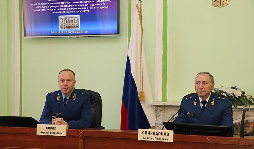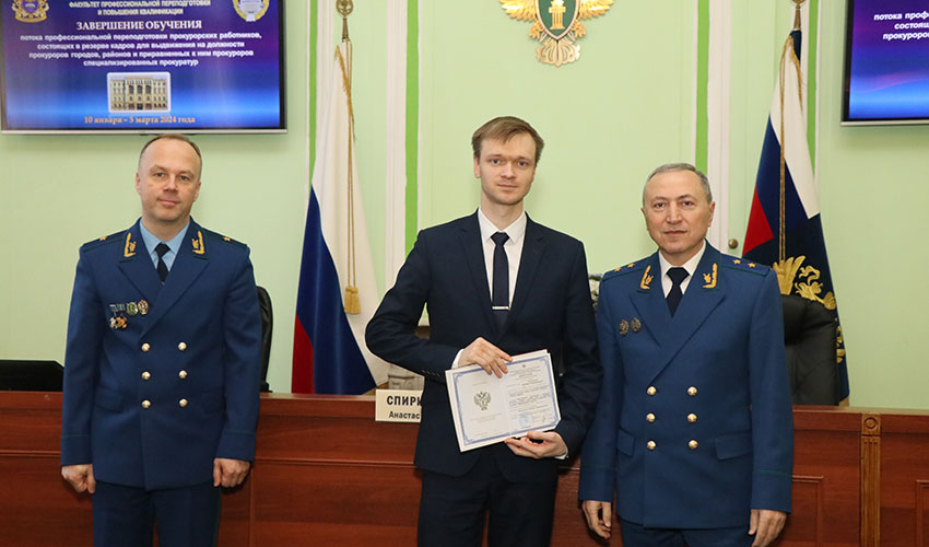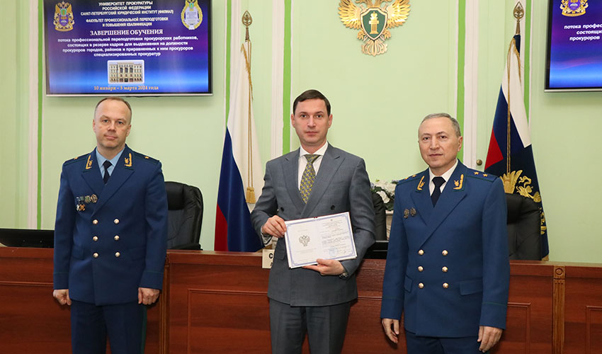 5 марта 2024 года в Санкт-Петербургском юридическом институте (филиале) Университета прокуратуры Российской Федерации (далее – Институт) завершилось обучение слушателей по программе профессиональной переподготовки прокурорских работников, состоящих в резерве кадров для выдвижения на должности прокуроров городов, районов и приравненных к ним прокуроров специализированных прокуратур. В мероприятии приняли участие директор Института государственный советник юстиции 2 класса Спиридонов А.П., заместитель директора Института государственный советник юстиции 3 класса Короп А.Б. Темы программы профессиональной переподготовки изучались в ходе лекций и семинарских занятий, а также выездных занятий, круглых столов, семинаров по обмену опытом и деловых игр. В результате обучения обучающиеся систематизировали имеющиеся знания по вопросам деятельности и информационного обеспечения в органах прокуратуры, участия прокурора в рассмотрении дел судами, прокурорского надзора, международного сотрудничества в сфере прокурорской деятельности. В ходе воспитательной работы слушатели посетили музеи, объекты исторического и культурного наследия. Поздравляем слушателей с итоговой аттестацией и желаем успехов в дальнейшей профессиональной деятельности!