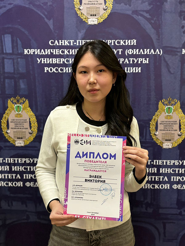 Поздравляем студенток юридического факультета Санкт- Петербургского филиала Университета прокуратуры Российской Федерации Элбек Викторию и Сивцеву Анжелику, которые вошли в состав победителей Всероссийского Конкурса творчества среди обучающихся образовательных учреждений высшего образования «Международный день родного языка». В марте 2024 года в Санкт-Петербургском государственном университете промышленных технологий и дизайна были подведены итоги Всероссийского конкурса творчества. По итогам конкурса студентки юридического факультета Санкт-Петербургского филиала Университета прокуратуры Российской Федерации награждены дипломами «Победитель» Элбек Виктория (творческий конкурс - «эссе») и Сивцева Анжелика (творческий конкурс - «песня»). Работа Виктории вместе с работами других победителей в данной номинации будет опубликована в электронном сборнике. Поздравляем Элбек Викторию и Сивцеву Анжелику, желаем дальнейших творческих успехов! Благодарим студентку 1 курса Абидову Марию и студента 3 курса Латышева Павла за помощь в подготовке наших участников к Конкурсу. |