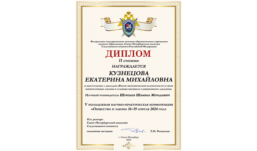 16-19 апреля 2024 г. в Санкт-Петербургской академии Следственного комитета состоялась V Молодежная научно-практическая конференция «Общество и закон», в которой приняли участие около 100 студентов и курсантов из 14 высших учебных заведений России и Белоруссии. На конференции были обсуждены вопросы обеспечения экономической безопасности, финансовой самостоятельности России, использования налоговых механизмов для противодействия легализации преступных доходов, влияния санкций на экономическую безопасность организаций, взаимодействия правоохранительных органов различных государств и другие актуальные проблемы. В конференции приняла участие студентка 2 курса юридического факультета Института Кузнецова Екатерина Михайловна с научной работой «Риски экономической безопасности в сфере корпоративных закупок в условиях внешнего санкционного давления» (научный руководитель – заведующий кафедрой общегуманитарных и социально-экономических дисциплин Шурпаев Ш.М.). |