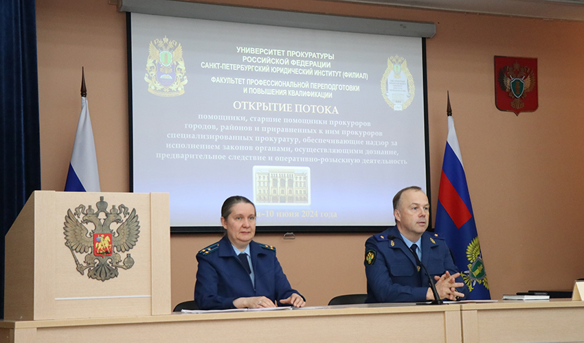 14 мая 2024 года в Санкт-Петербургском юридическом институте (филиале) Университета прокуратуры Российской Федерации состоялось открытие потока слушателей, проходящих обучение по программе повышения квалификации помощников, старших помощников прокуроров городов, районов и приравненных к ним прокуроров специализированных прокуратур, обеспечивающих надзор за исполнением законов органами, осуществляющими дознание, предварительное следствие и оперативно-розыскную деятельность (в том числе за расследованием преступлений, совершаемых с использованием информационных технологий). К обучению приступили 98 слушателей. Заместитель директора Института государственный советник юстиции 3 класса Короп А.Б. довел до аудитории основные требования, предъявляемые Генеральной прокуратурой Российской Федерации, поставил задачи неукоснительного соблюдения требований учебного плана и правил распорядка обучающихся, обратил внимание на вопросы воспитательно-патриотической работы с потоком и запланированные мероприятия.