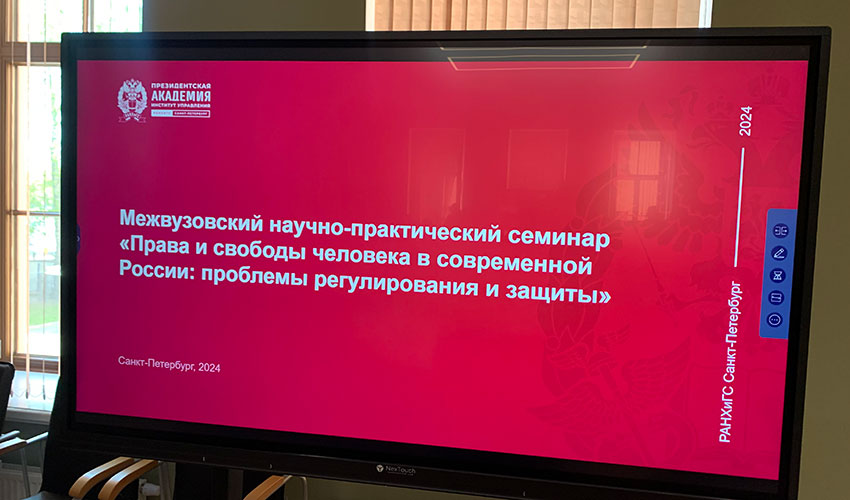 15 мая 2024 г. доценты кафедры государственно-правовых дисциплин О.А. Гуреева и Я.К. Чепенко, старший преподаватель кафедры М.Б. Кабанова приняли участие в Межвузовском научно-практическом семинаре «Права и свободы человека в современной России: проблемы регулирования и защиты» на площадке юридического факультета Северо-Западного института управления Российской академии народного хозяйства и государственной службы при Президенте Российской Федерации.
