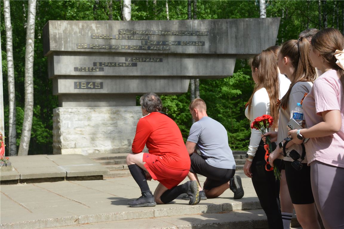 Участники возложили цветы к подножию памятника «Защитникам Ленинградского неба», расположенного в лесопарке «Сосновка», и почтили память о погибших в Великой Отечественной войне минутой молчания. Мемориал установлен на месте расположения одноимённого аэродрома, который функционировал в годы блокады Ленинграда и Великой Отечественной войны. Летчики 159-го и 11-го Гвардейских истребительных полков, которые базировались на аэродроме, круглосуточно несли вахту по защите Ленинградского неба и «Дороги жизни». Также аэродром Сосновка знаменит тем, что весной 1942 года сюда доставили из Куйбышева (Самара) партитуру Седьмой симфонии Дмитрия Шостаковича, названную в последующем Ленинградской.