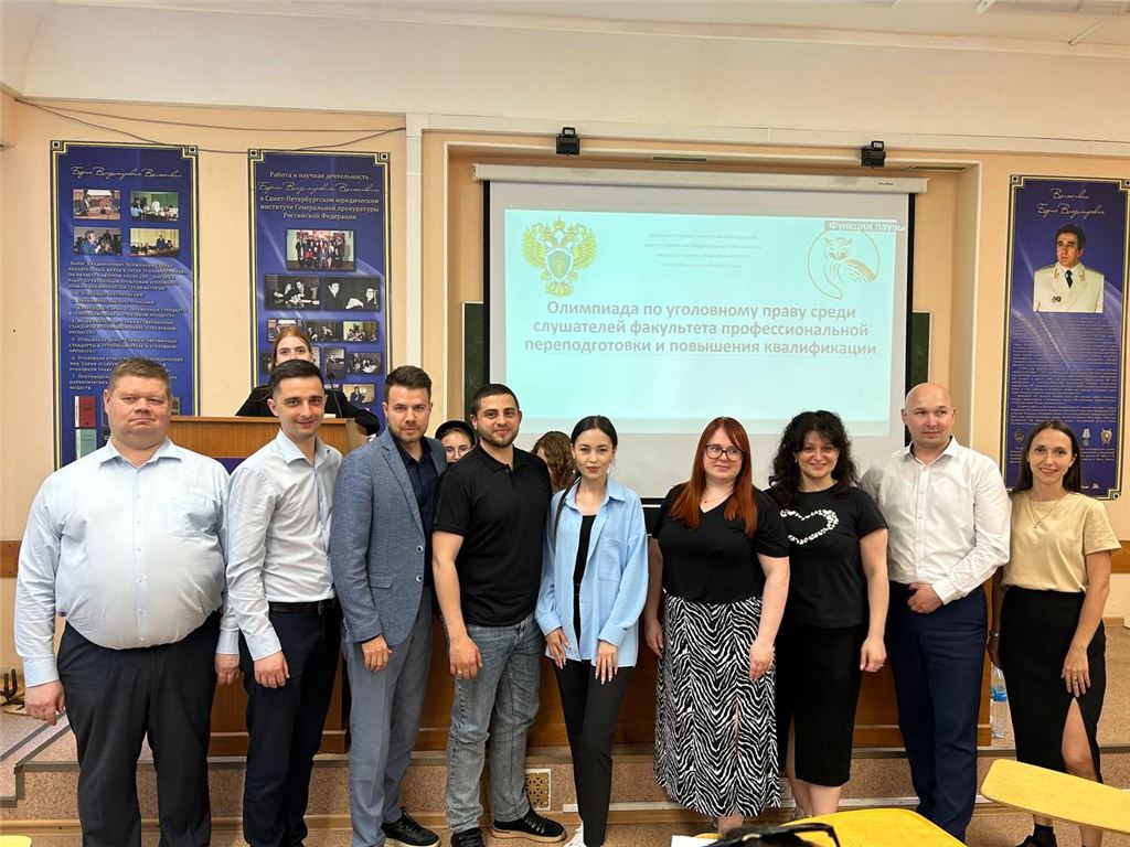 31 мая 2024 года в Санкт-Петербургском филиале Университета прокуратуры Российской Федерации состоялась олимпиада по уголовному праву среди 8 команд помощников, старших помощников прокуроров городов, районов и приравненных к ним прокуроров специализированных прокуратур, обеспечивающих надзор за исполнением законов органами, осуществляющими дознание, предварительное следствие и оперативно-розыскную деятельность.