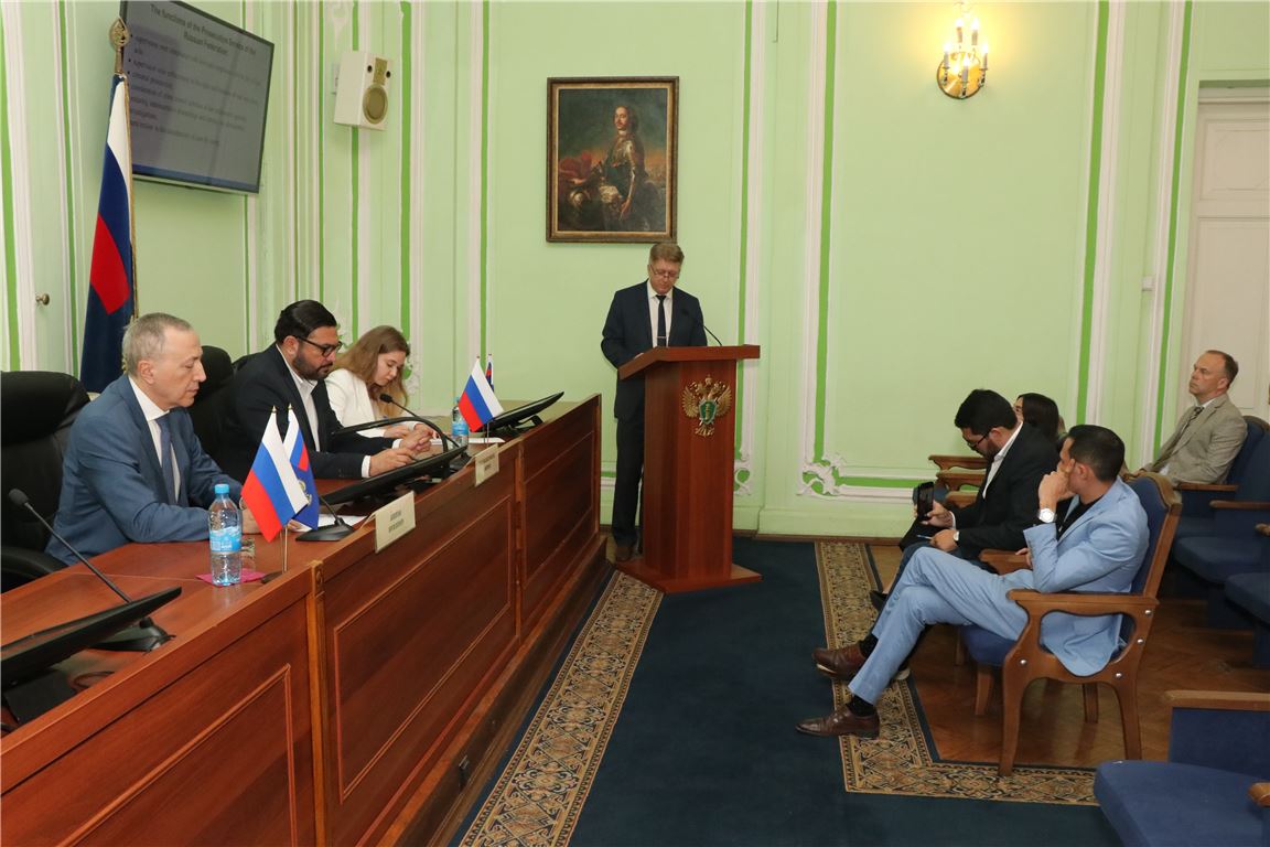 В ходе встречи перед иностранными коллегами выступил и.о. заведующего кафедрой прокурорского надзора и участия прокурора в рассмотрении уголовных, гражданских и арбитражных дел, Игорь Юрьевич Мурашкин по вопросам организации деятельности прокуратуры Российской Федерации.