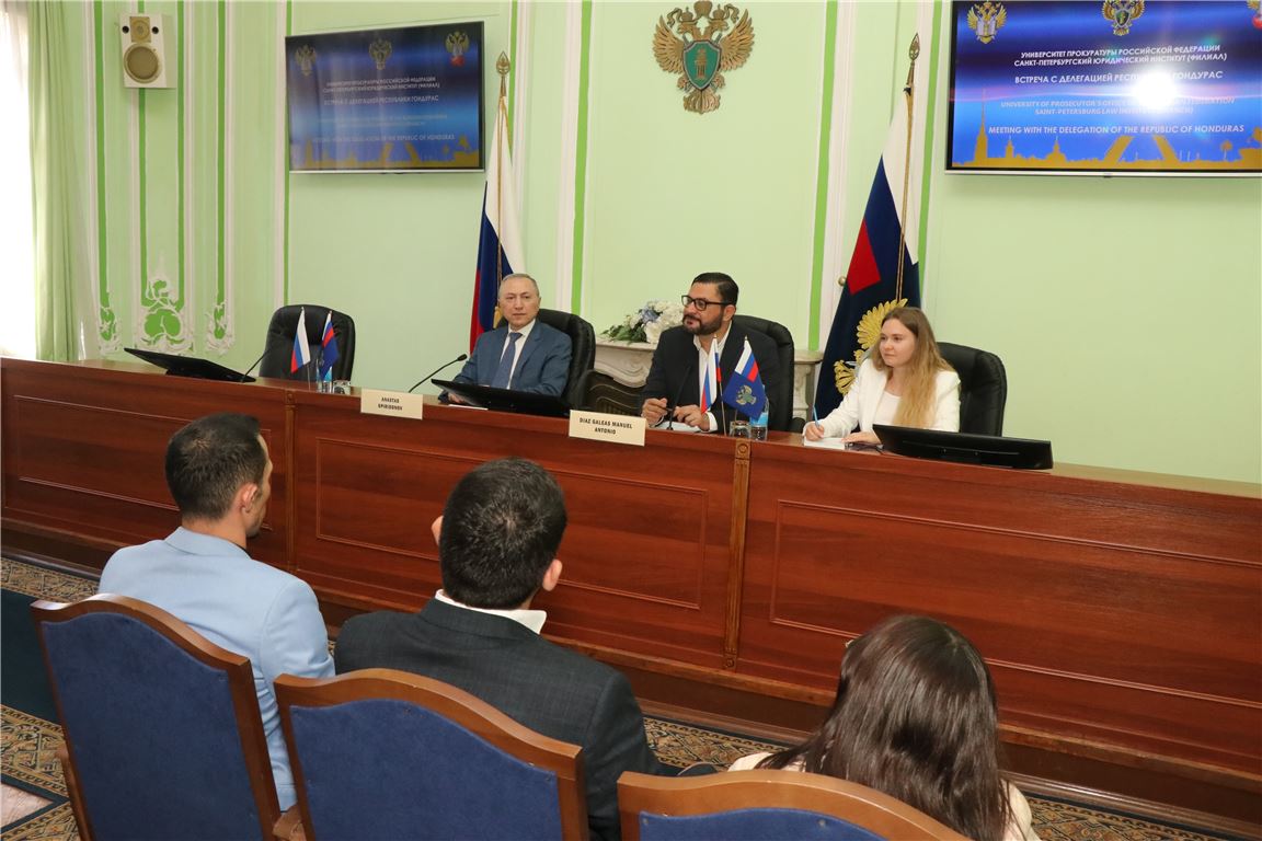 5 июня 2024 г. в рамках реализации программы международно-правового сотрудничества Генеральной прокуратуры Российской Федерации состоялся рабочий визит делегаций Генеральной прокуратуры Республики Гондурас в Санкт-Петербургский филиал Университета прокуратуры Российской Федерации для ознакомления с организацией учебного процесса юридического факультета и работой по повышению квалификации, а также научно-исследовательской деятельностью с целью дальнейших перспектив сотрудничества.