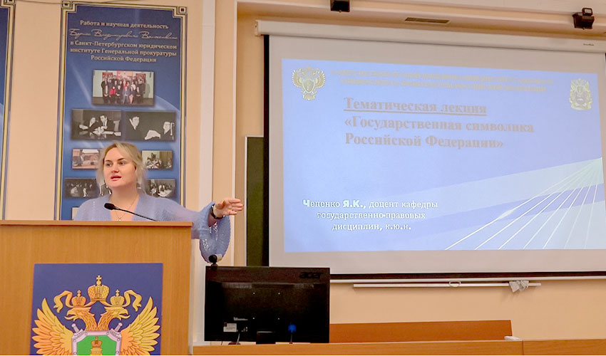 21 сентября 2024 года в Санкт-Петербургском филиале Университета прокуратуры Российской Федерации в рамках выполнения плана государственно-патриотического воспитания доцент кафедры государственно-правовых дисциплин Я.К. Чепенко выступила с тематической лекцией «Государственная символика Российской Федерации» для студентов 1 и 2 курса юридического факультета. Лекция вызвала интерес у обучающихся, студенты узнали важные исторические факты о государственном флаге, гербе и гимне Российской Федерации, состоялся живой диалог.