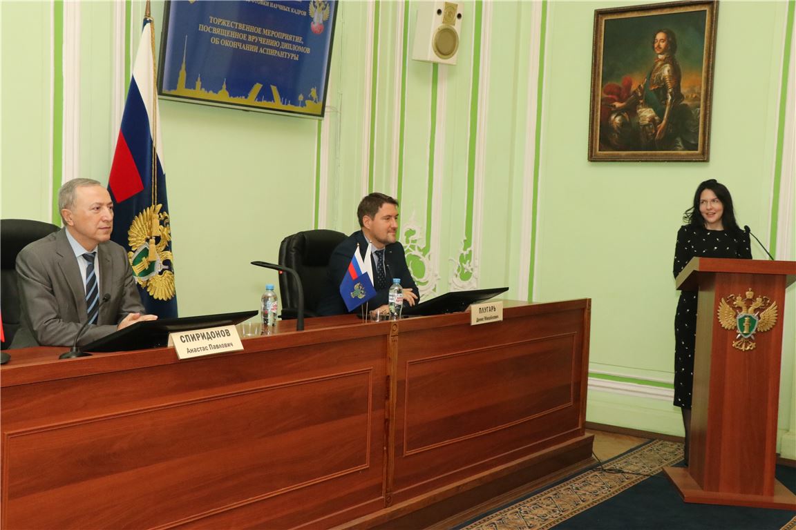 С приветственным словом к выпускникам обратился директор Института, государственный советник юстиции 2 класса, д.ю.н. Спиридонов А.П., который поздравил их с успешным окончанием аспирантуры и пожелал дальнейших успехов в научной деятельности. Он отметил, что аспирантура является важным этапом в формировании профессиональных компетенций и научных знаний, которые необходимы для успешной карьеры в области права и юриспруденции.