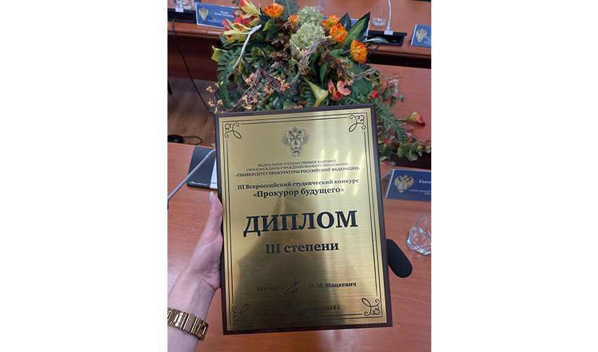 28–29 ноября 2024 г. в Университете прокуратуры Российской Федерации состоялся III Всероссийский студенческий конкурс «Прокурор будущего», который прошел в целях выявления и развития интеллектуальных и творческих способностей обучающихся; поддержки наиболее перспективных проектов и других значимых инициатив обучающихся по приоритетным направлениям деятельности органов прокуратуры; повышения интереса к профессиональной деятельности прокурорского работника; раскрытия творческого потенциала обучающихся. Участниками конкурса стали студенты 4–5 курсов Университета прокуратуры Российской Федерации, институтов (филиалов) Университета, института прокуратуры ФГБОУ ВО «Московский государственный юридический университет им. О.Е. Кутафина (МГЮА)», ФГБОУ ВО «Саратовская государственная юридическая академия», ФГБОУ ВО «Уральский государственный юридический университет им. В.Ф. Яковлева». Конкурс состоял из трех этапов: Первый этап — тестирование участников Конкурса по вопросам учебных дисциплин, составляющих содержание основной образовательной программы специалитета. Второй этап — выполнение заданий, моделирующих действия прокурора при проведении прокурорской проверки. Третий этап — защита перед конкурсной комиссией инновационного проекта «Прокурор будущего». По итогам подсчета результатов за каждый этап дипломом 3 степени награждена Садкова Полина, студентка 5 курса юридического факультета Института. Поздравляем Садкову Полину и желаем дальнейших успехов! |