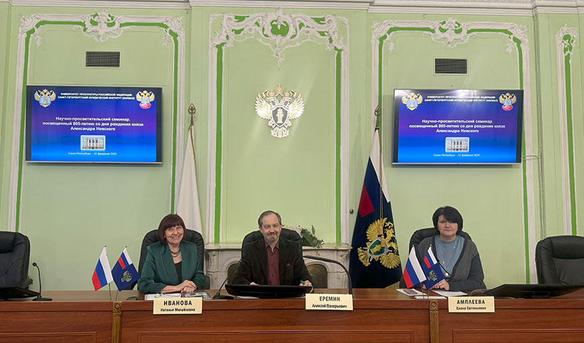 12 февраля 2025 г. в Санкт-Петербургском филиале Университета прокуратуры Российской Федерации состоялся научно-просветительский семинар, посвященный 805-летию со дня рождения князя Александра Невского. Со вступительным словом к присутствующим обратилась Е.Е. Амплеева, заведующий кафедрой теории и истории, доцент. Модераторами семинара выступили доценты кафедры теории и истории государства и права Н.М. Иванова и А.В. Ерёмин. Участниками мероприятия были рассмотрены исторические события XIII века северо-западной Руси, дана оценка личности князя Александра Невского и его деятельности для истории России. Активное участие в обсуждении докладов приняли студенты 1 курса юридического факультета Института. Выражаем благодарность всем участникам семинара за проявленный интерес и желаем дальнейших успехов!